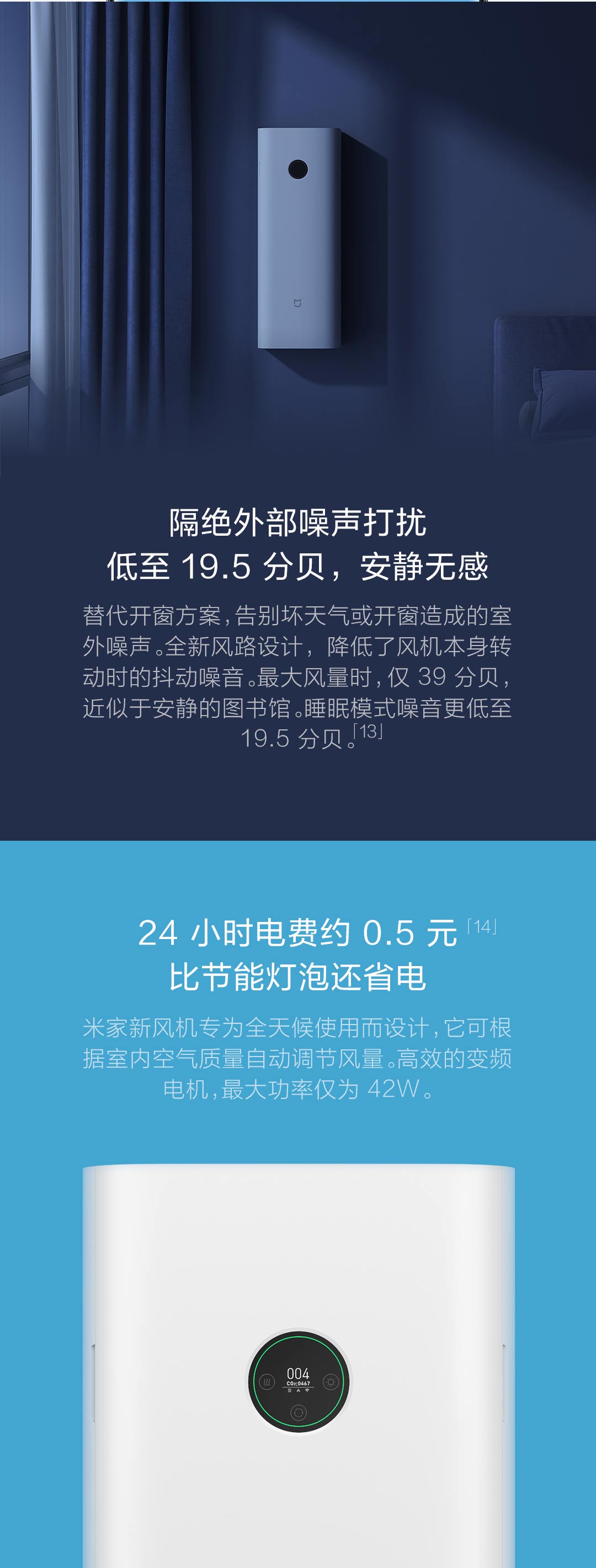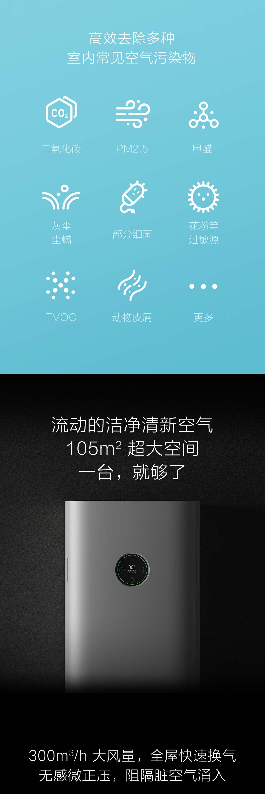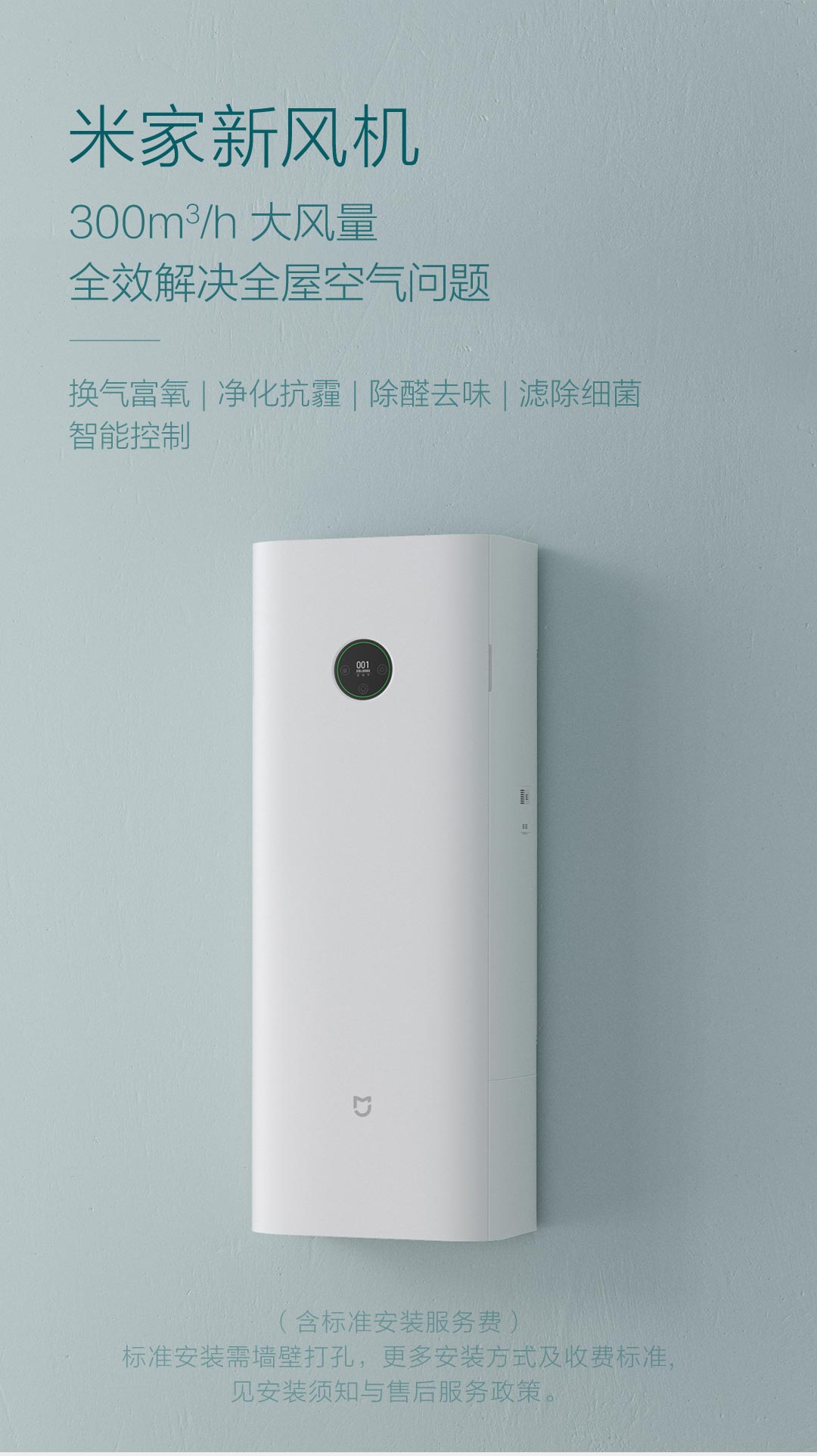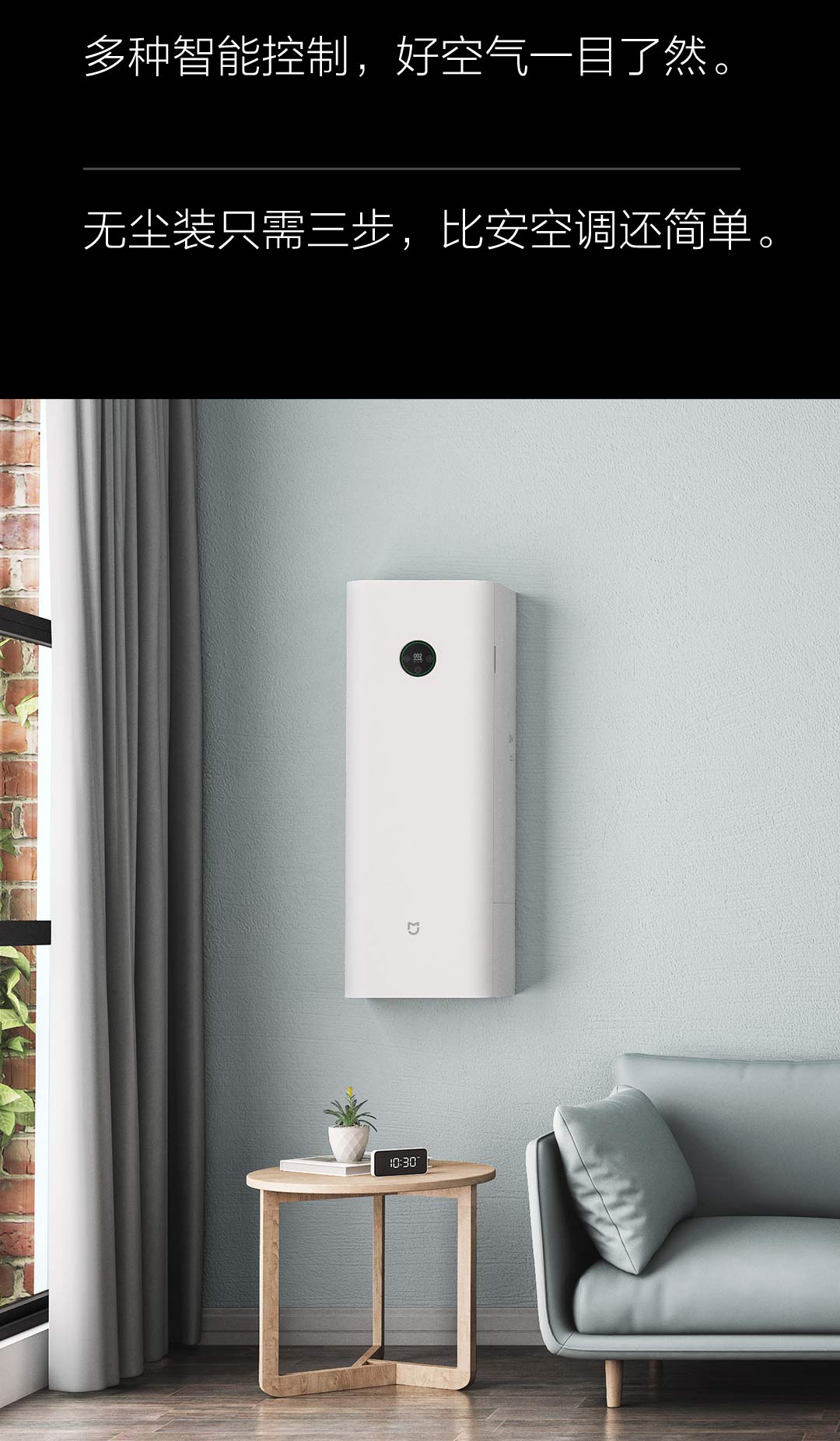 Название продукта: Mijia Fresh air system Модель продукта: MJXFJ-300-G1 Размер продукта: 970 × 365 × 230 мм Вес нетто: около 16 кг (включая фильтрующий элемент) Номинальный объем воздуха: 300 м³ / ч Область применения: ≤105㎡ Номинальное напряжение: 220 В Номинальная частота: 50 Гц Номинальная мощность: 35 Вт Мощность вспомогательного отопления: 800 Вт Уровень шума: ≤36 дБ (A) (режим ожидания 20,4 дБ (A)) Беспроводное соединение: Wi-Fi IEEE 802.11b / g / n 2.4G