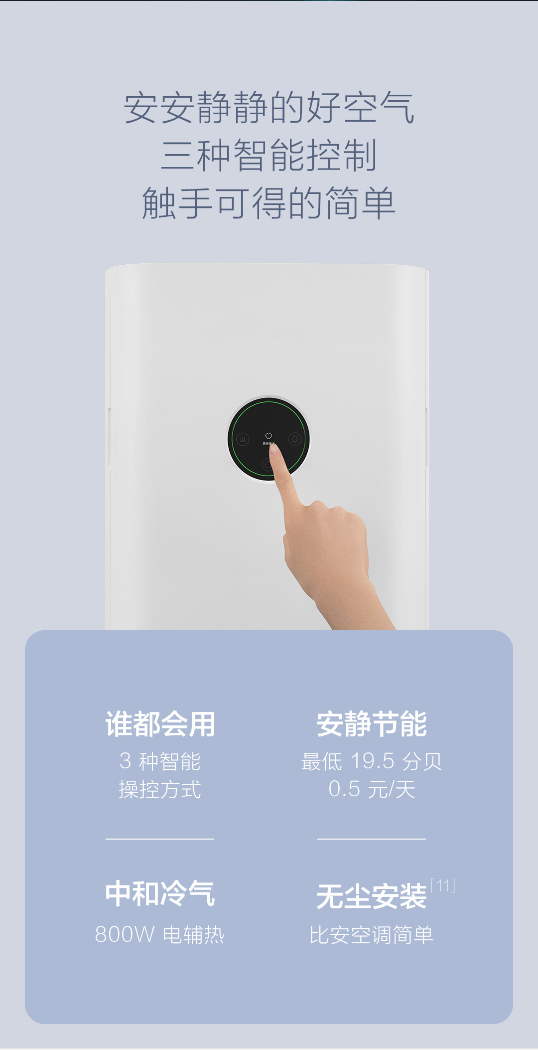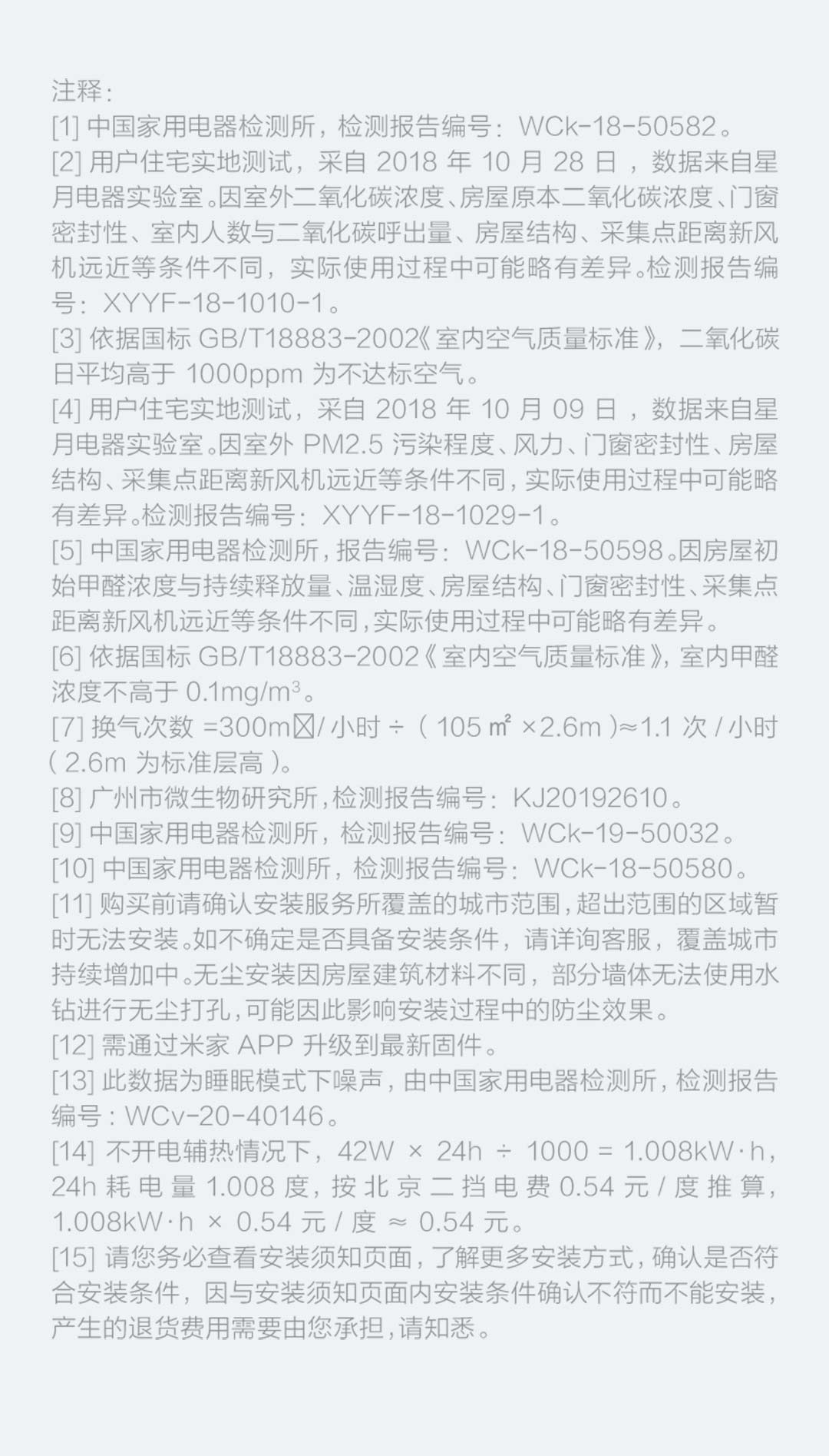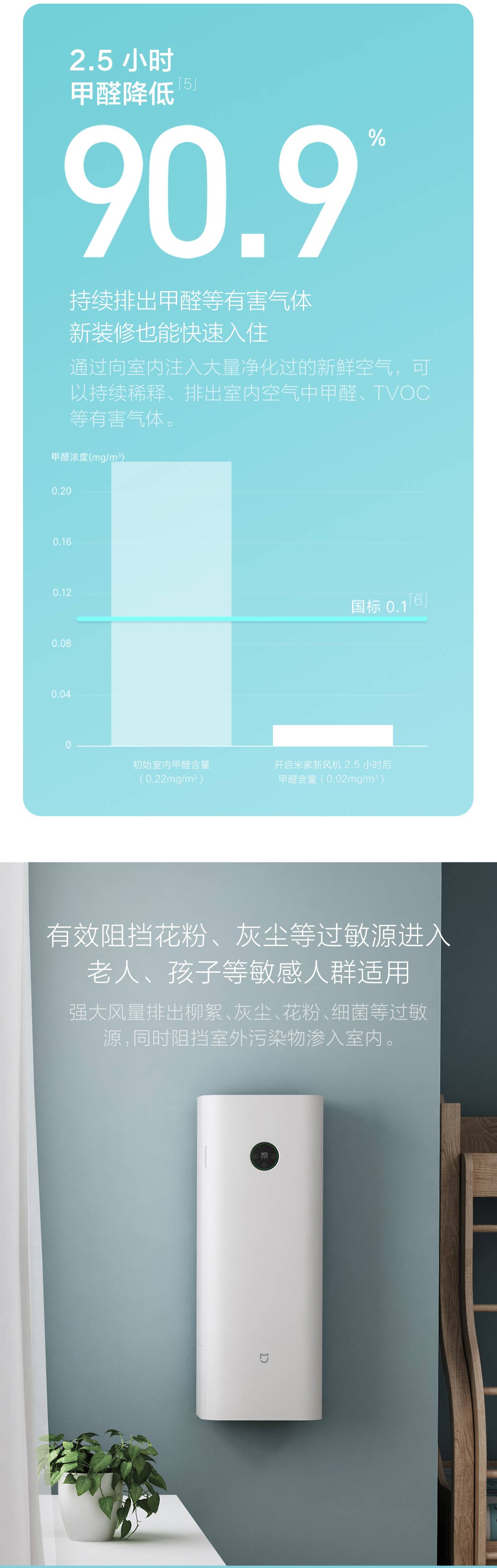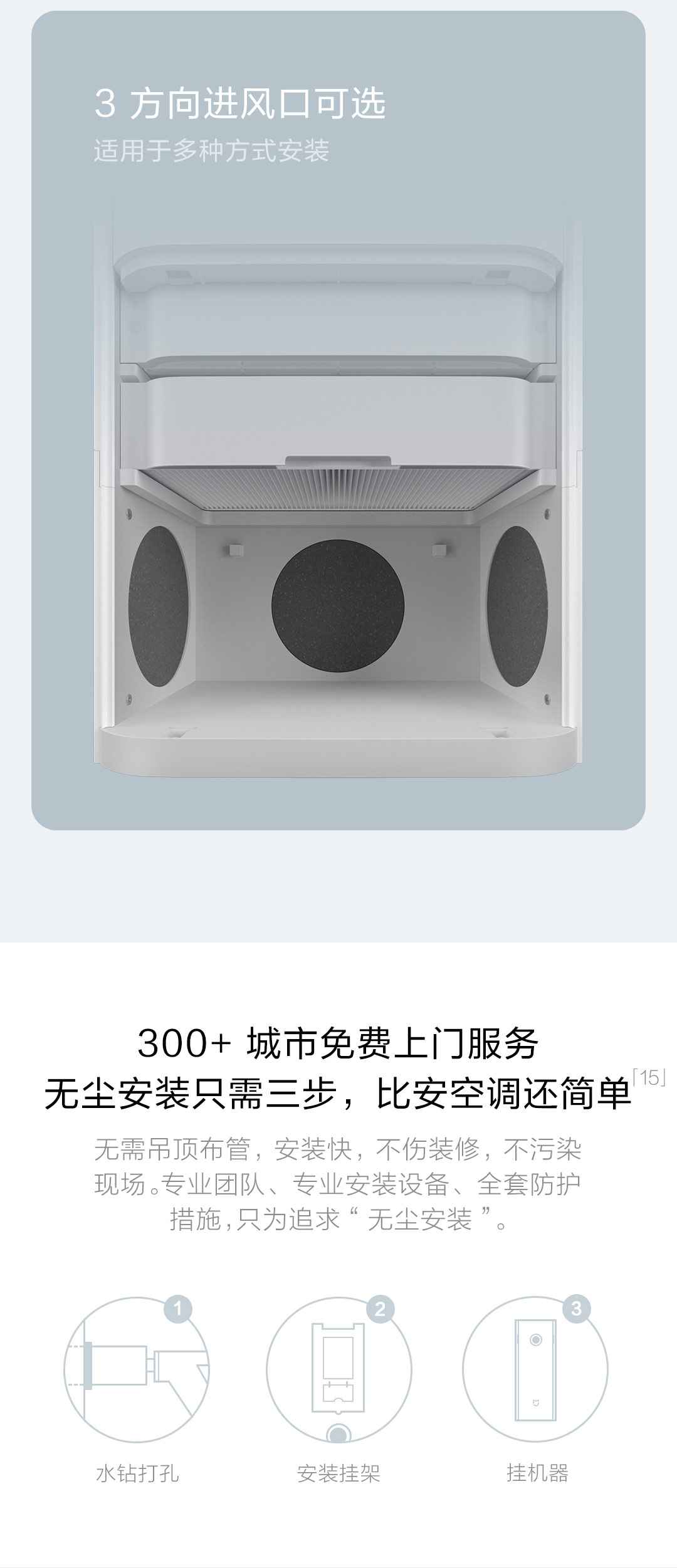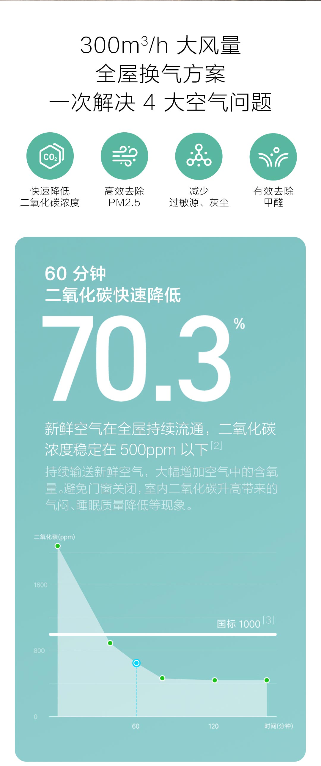 Название продукта: Mijia Fresh air system Модель продукта: MJXFJ-300-G1 Размер продукта: 970 × 365 × 230 мм Вес нетто: около 16 кг (включая фильтрующий элемент) Номинальный объем воздуха: 300 м³ / ч Область применения: ≤105㎡ Номинальное напряжение: 220 В Номинальная частота: 50 Гц Номинальная мощность: 35 Вт Мощность вспомогательного отопления: 800 Вт Уровень шума: ≤36 дБ (A) (режим ожидания 20,4 дБ (A)) Беспроводное соединение: Wi-Fi IEEE 802.11b / g / n 2.4G
