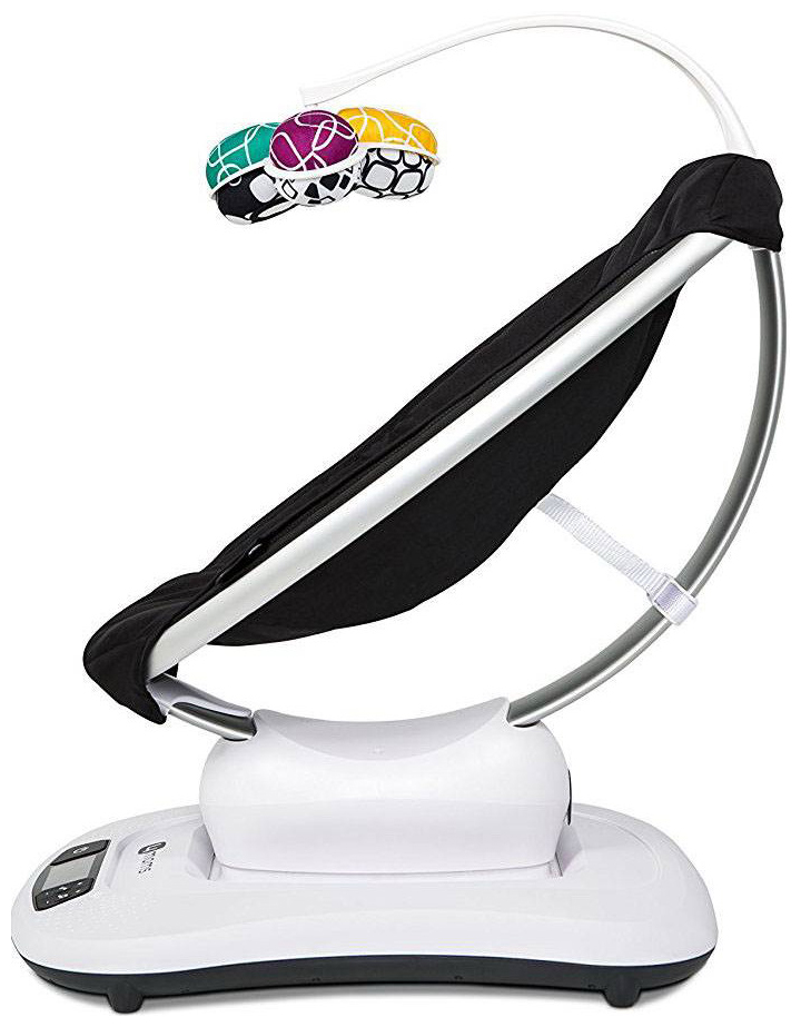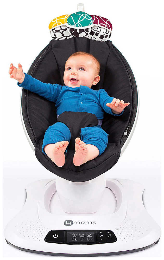 Интенсивность и выбор режима работы mamaRoo регулируются при помощи простого и понятного дисплея. Конструкция оснащена удобной поворотной дугой с подвесными игрушками. Простые на первый взгляд двусторонние игрушки из ткани результат аналитической работы специалистов. Комбинации цветов, форма игрушек и высота, на которой они подвешены, подобраны с учетом особенностей зрительного восприятия младенцев с рождения. В новой модели mamaRoo 4.0 двусторонние игрушки включают в себя зеркальце, шуршащие элементы и погремушку. Для глаз новорожденных более комфортными являются черно-белые цвета (одна сторона игрушек), а для малышей постарше более яркие и красочные детали (вторая сторона).