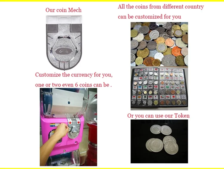 Когда вы размещаете заказ, пожалуйста, отправьте фотографию Вашей монеты в нашу службу поддержки клиентов, тогда мы сможем подтвердить монету, которую вы хотите использовать, и мы изготовим торговые автоматы в соответствии с вашими монетами. Как правило, по умолчанию механизм монет принимает одну монету один раз; И торговые автоматы подходят для размера капсулы 45 ~ 75 мм. Если у вас есть какие-либо другие требования, пожалуйста, свяжитесь с нашей службой поддержки клиентов. Поскольку продукты изготавливаются по индивидуальному заказу, пожалуйста, свяжитесь с нами, чтобы вовремя отправить вам идеальную продукцию. Когда мы производим торговые автоматы: Для клиентов ЕС, мы делаем их в соответствии с 1 евро монета. Для российских клиентов, Производство основано на 10 песо монет России. Для американских покупателей, что делает продукцию абсолютно безопасной исходя из $0,25 монеты. Для Саудовской Аравии Производство основано на 1 риальной монете. Для клиентов ОАЭ, Производство основано на 1 дирхаме монета. Для филиппинских клиентов, мы производим по Филиппинам 5 песо монет. Для австралийских клиентов мы производим 1 австралийскую монету. Для мексиканских клиентов, мы производим в соответствии с мексиканскими 10 песо. Для покупателей из Казахстана мы производим по 100 тенге монет. Для канадских клиентов, мы производим в соответствии с канадскими долларами. Для малайзийских клиентов, мы производим в соответствии с 1 ringgit монетой. Для тайских клиентов мы производим по 10 батским монетам. Для японских клиентов мы производим 100 Йен монет. Для клиентов из Сингапура мы производим 50 центовые монеты Сингапура. Если у вас есть другие требования, пожалуйста, свяжитесь с клиентом.