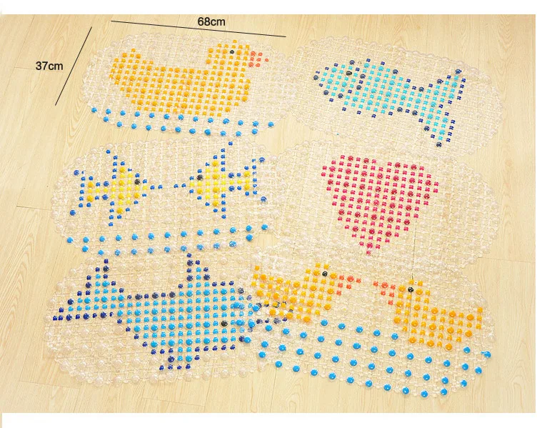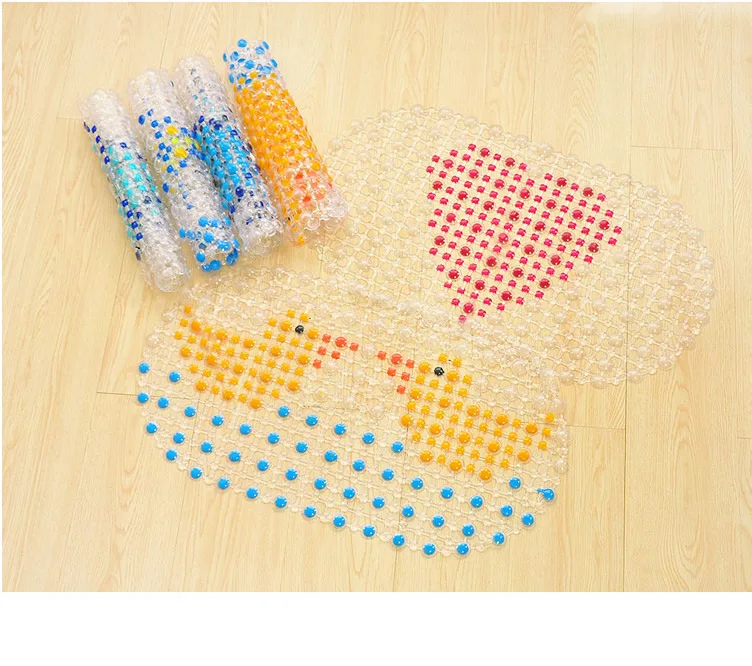Данный предмет представляет собой коврик для ванной из ПВХ, который изготовлен из высококачественного ПВХ. Его дно оснащено несколькими присосками, что позволяет легко фиксировать его на полу. Его верх имеет пузырьковый дизайн, он отлично подходит для защиты от скольжения и для массажа.