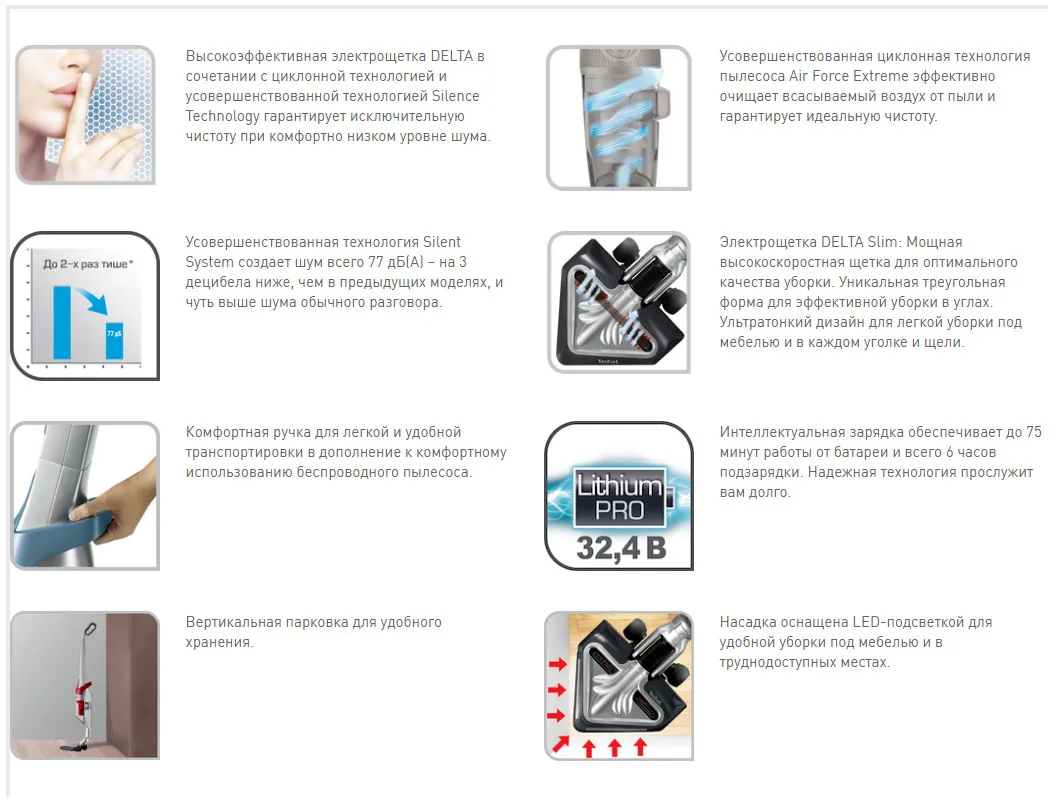 Беспроводной пылесос с насадкой DELTA и технологией Silence Technology, Насадка DELTA с активной щеткой с электроприводом (6,200 об/мин) в усовершенствованном дизайне для максимальной чистоты • Усовершенствованная технология Silence Technology создает шум всего 77 дБ(А) для невероятно тихого и комфортного использования, Безмешковый пылесос: контейнер для пыли объемом 0,5 л для максимального комфорта использования, Эргономичная ручка для удобной транспортировки и комфортного использования, Насадка DELTA Vision с LED-подсветкой для тщательной уборки даже под мебелью и в труднодоступных местах, Усовершенствованная циклонная технология пылесоса Air Force Extreme максимально очищает всасываемый воздух от пыли и грязи и гарантирует идеальную чистоту, Пылесос оснащен легкой и долговечной литий-ионной батареей напряжением 32,4 В и интеллектуальной подзарядкой, которая обеспечивает до 75 минут автономной работы и всего 6 часов подзарядки, Вертикальная парковка для удобного хранения, 3 скорости для любого типа покрытия.