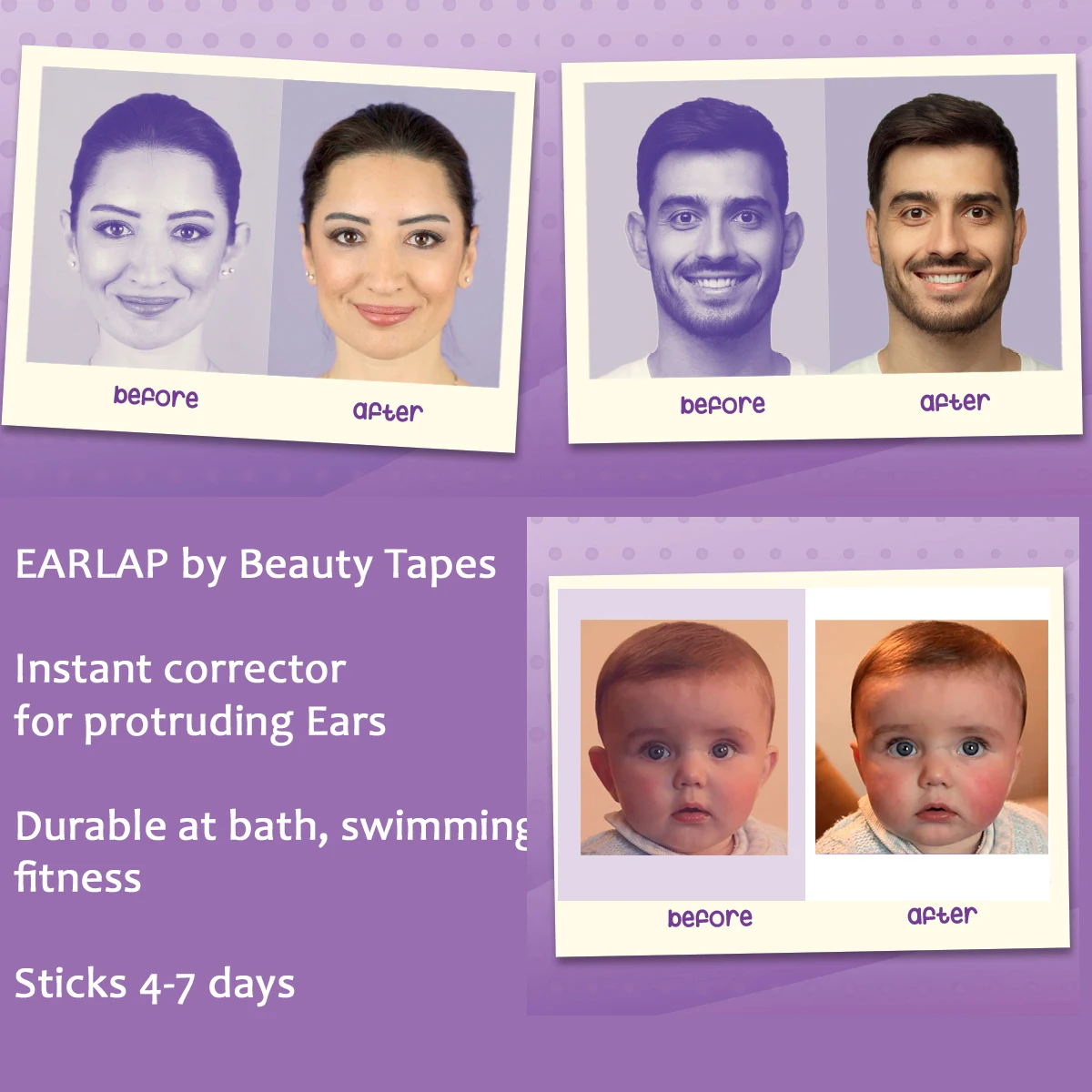 Ушной круг-корректор выступающих ушей, изготовленный из медицинских и прочных двухсторонних лент. Он прилипает к уху и прилегающей части головы, обеспечивая оптимальное позиционирование уха и, в частности, хрящ, поэтому оба развиваются должным образом. Можно использовать Ушную раковину от 3 месяцев до взрослых Корректирующая эффективность ушной раковины: Для младенцев и детей в возрасте от 3 месяцев до 6 лет. Хрящ находится в наиболее гибком состоянии во время стадии, когда ухо растет и развивается, что означает, что это лучшее время, чтобы исправить его. Как продукт, это именно то, что предназначено для Earlap.