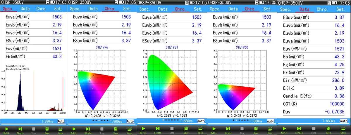 DescriptionOHSP-350 serieshandheld spectral colorimeter illuminance meter set of measurement function Spectrum, illumination, chromaticity, light flicker in one. Using 5 inch screen, the measurement parameters and curves are displayed in real time. It is convenient to use and can be directly tested in the lighting field.,Not only measurable LED wide spectrum light source, but also can measure the narrow spectrum light sources, such as CFL, HID, and so on.,It can also be used to test the environmental light of stage design, building light, plant growth lamp, engineering application and so on.
