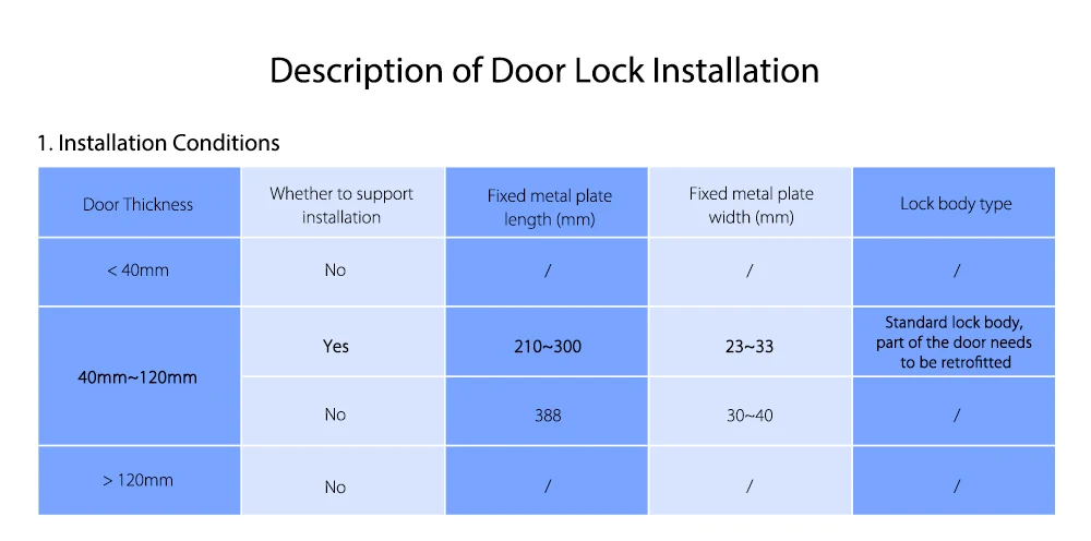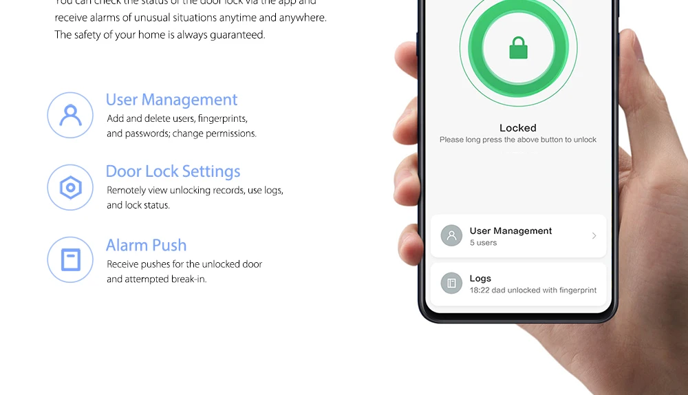 Источник питания: 8 батарей AA (6 В постоянного тока, не входят в комплект), источник аварийного питания типа C (5 В постоянного тока) Емкость пользователя: 50 отпечатков пальцев, 50 постоянных паролей, 25 устройств NFC, 25 временных паролей, 8 временных паролей Беспроводное подключение: Bluetooth 5,0 Исполнительный стандарт: GA 374-2019, GA/T 73-2015 (блокировочный сердечник), GB21556-2008 Рабочая температура: -25 °C ~ + 70 °C Рабочая влажность: 0 ~ 93% RH, без конденсации Уровень безопасности продукта: B Уровень безопасности сердечника замка: Класс C (самый высокий уровень) Совет: 8 батареек AA не входят в посылка, пожалуйста, нажмите здесь, чтобы купить самостоятельно.