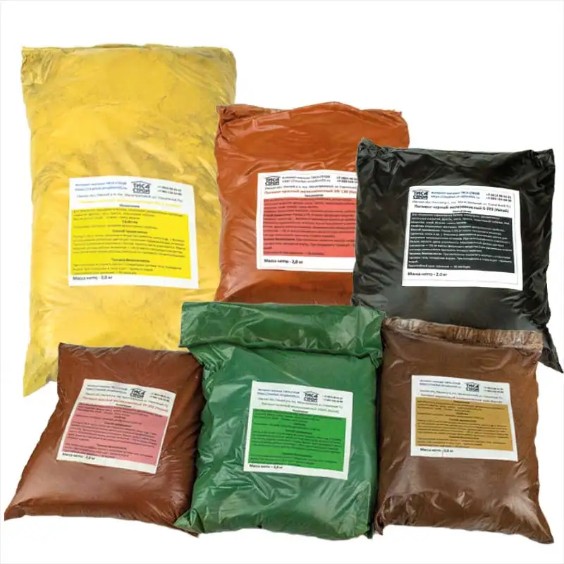 Кроме черного цвета, вы найдете у нас все основные цвета. Пигменты разных цветов можно смешивать между собой и существенно расширить палитру. Сферы применения: Производство силикатного кирпича; Производство цветного бетона; Производство тротуарной плитки; Производство искусственного камня; Производство пластмасс; Производство спортивных покрытий; Производство ЛКМ; Производство полимер-песчаной черепицы; Железноокисные пигменты используются для придания различных цветов бетонным и растворным смесям, кирпича силикатного, изделия из гипса, мрамора искусственного, бетонной черепицы, элементов благоустройства территорий и малой садовой архитектуры. Ориентировочный расход пигмента в бетонном растворе, интенсивность окрашивания: Расход пигмента для бетона на 50 кг цемента: пастельные тона, особо светлые тона 0.5 - 1.0 кг. средняя 1.5 - 2.0 кг. насыщенная (высокая) 2.5 - 3.0 кг. Рекомендуемая дозировка - максимум 6% от массы вяжущего (цемента, гипса). При превышении дозировки может уменьшится прочность готовых изделий. Окончательный цвет изделия зависит от исходного цвета песка и цемента. Чем светлее и белее оттенок песка и цемента, тем насыщенней будет цвет готового изделия. Желательно использовать белый цемент.