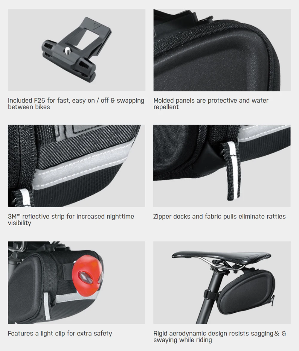 Новая идея в конструкции клинового пакета сочетает в себе формованные боковые панели с гибкой тканью 600 денье для формирования полужесткой, устойчивой к атмосферным воздействиям седельной сумки. Большая панель, открывающаяся сбоку, обеспечивает легкий доступ ко всей вашей седельной передаче. Внутренние Сетчатые Карманы удерживают ключи и небольшие инструменты на месте во время езды. Быстрый Клик®Совместимость для быстрой, легкой передачи между велосипедами.