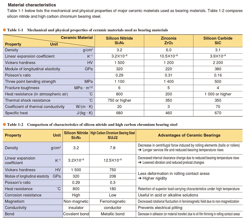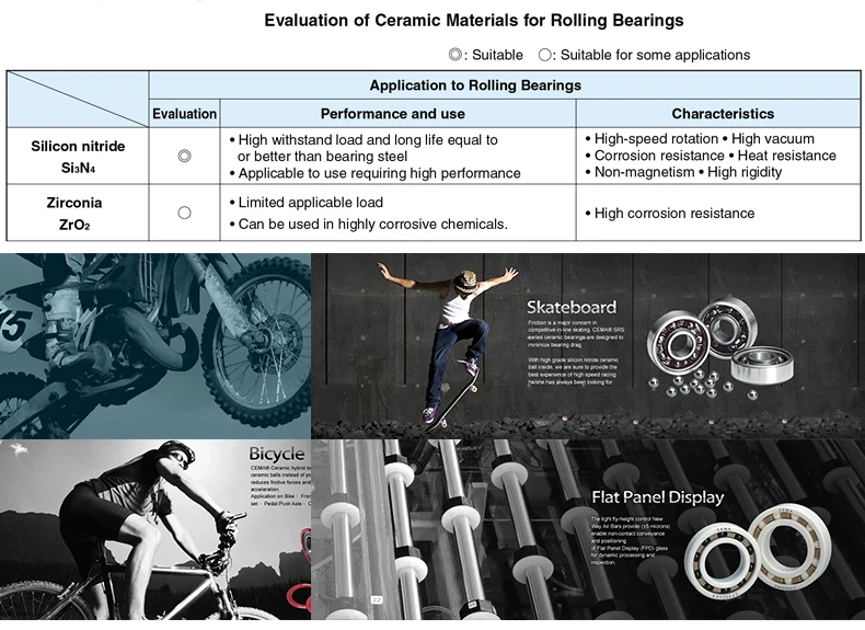 Керамические подшипники, включая компоненты, изготовленные из керамики, имеют особые свойства, которые не имеют стальные подшипники, такие как немагнитные или изоляционные. Они могут быть использованы в новых применениях, где обычные подшипники не были практичными.