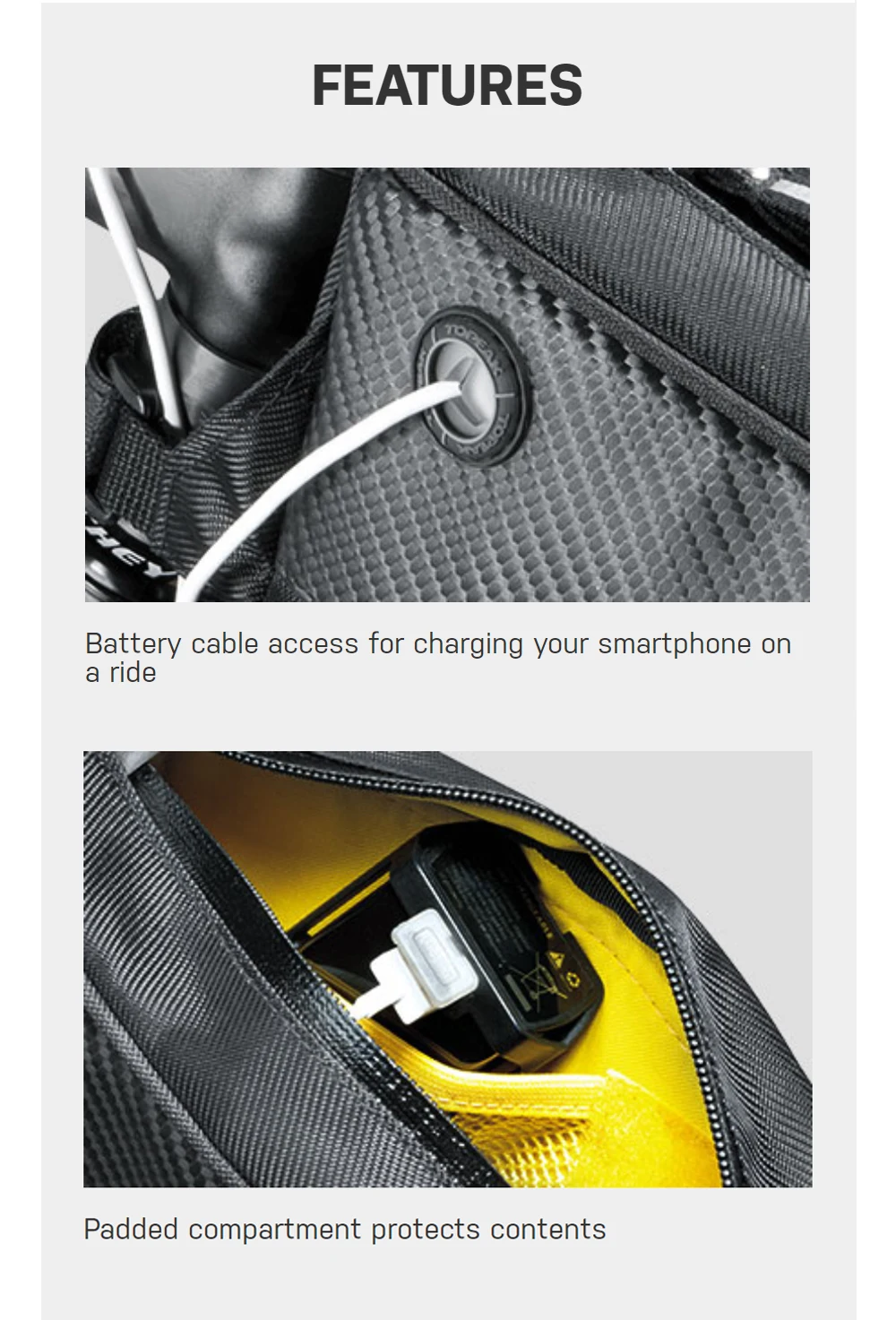 Большая вместительная сумка с верхним креплением для велосипедистов, обеспечивающая быстрый и легкий доступ к энергетическим барам, телефону, кошельку, инструментам или любому маленькому предмету первой необходимости. Имеет доступ к кабелю аккумулятора для зарядки мобильного устройства.