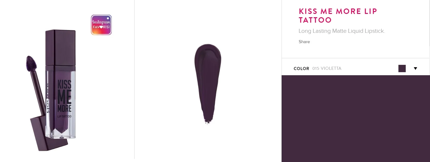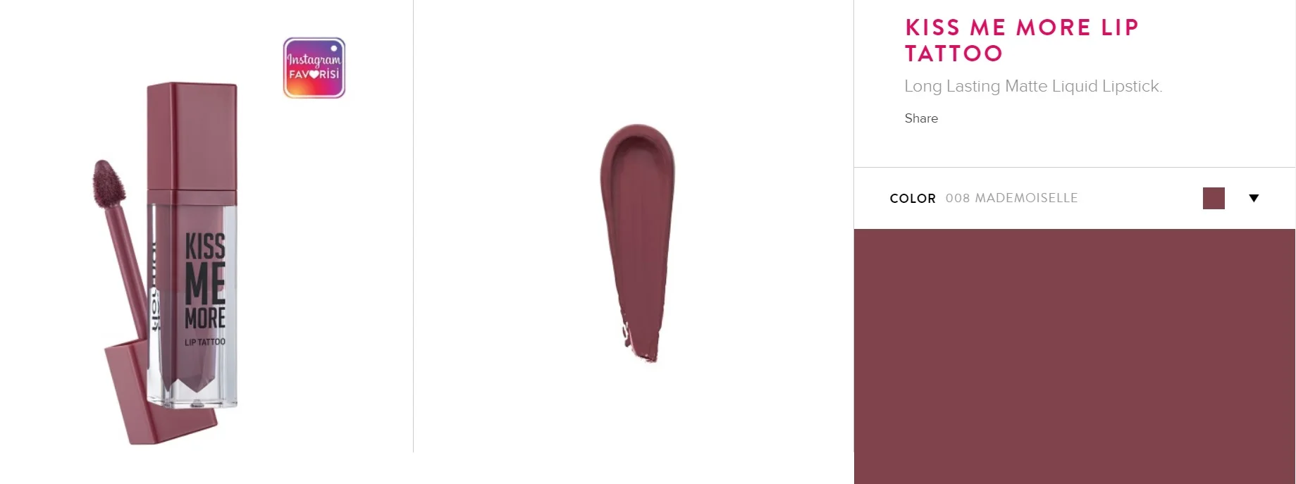 Если вы ищете помаду, которая не будет растушевываться и имеет интенсивную пигментацию, поцелуй меня, больше татуировок на губы вам подойдет! Он остается на губах с ее длительное формулой! Благодаря гладкой и кремовой текстуре жидкая помада легко наносится благодаря мягкому губчатому аппликатору. В отличие от других матовых помад, она не высыхает губы благодаря своей богатой формуле и обеспечивает простоту использования. Его мягкая текстура делает его невероятно легким. Более того, товар доступен в 16 различных цветах для вашего стиля! Для безупречного и долговечного эффекта, все, что вам нужно сделать,-подождите 1 минуту раздельно губами после нанесения на продукт, чтобы он был сухим и удобным! Код товара: 0313105-012 7,5 мл