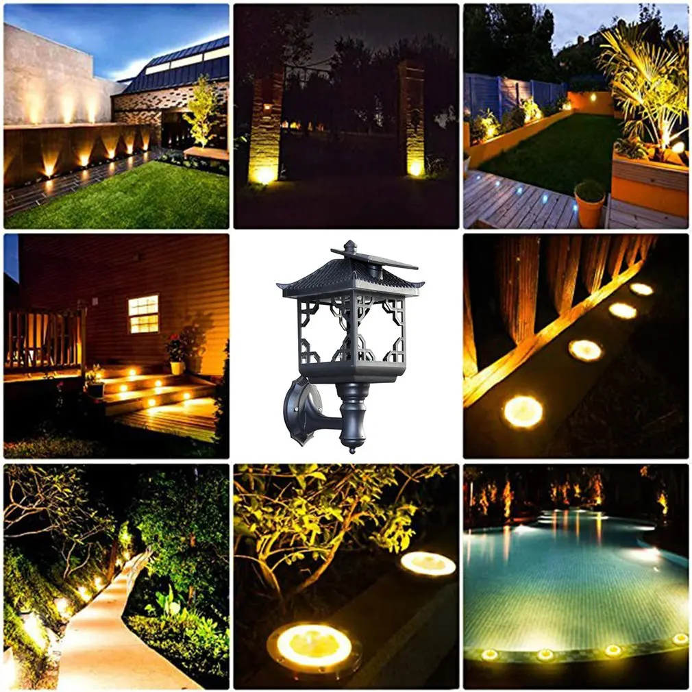 Features: 1. Long lasting and Durable : Luminous time: full 6-8 hours or more, the specific pickup in the day Weather .(Pay attention to keep the solar panels clean, maximize effectiveness. ) 2. Durable and Strong: Outdoor rainproof waterproof rustproof. Easy to install on the wall and easy to use. 3. Intelligent light control mode: Just need to set for once , no need to repeat adjustment in the future . Can be used in multiple occasions like Garden Park Courtyard Hallways . Description: Oriental style lamp with 4 corners, solar powered. With black cover and be hanged on the wall light. Specifications: Main Color: Black Light Color: White Rated power: 5W Charging Time: 6-8 hours Size: 190*190*330(mm) Rated voltage: 1.2(V) Package Included: 1 * Walled Light