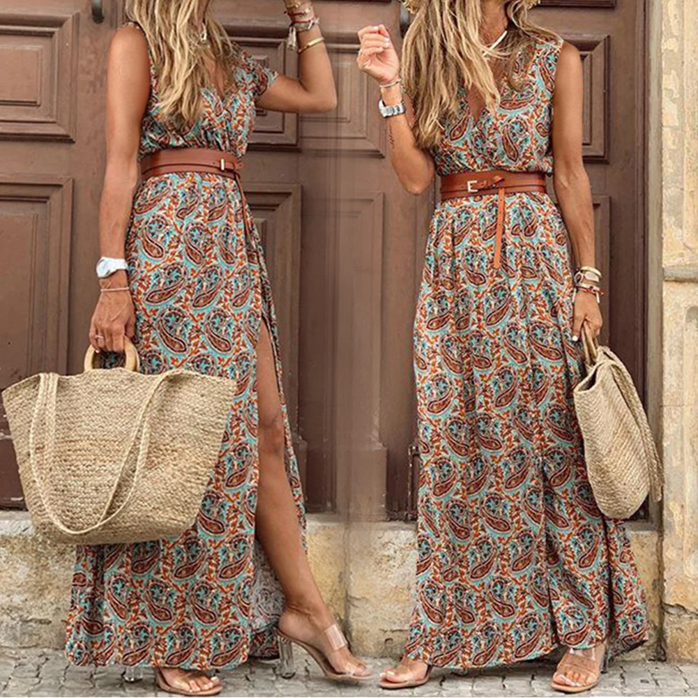 Новое летнее сексуальное элегантное женское платье в стиле бохо с v-образным вырезом, без рукавов, с принтом пейсли, с поясом, с большим подолом, длинные платья, вечерние, пляжные, уличные