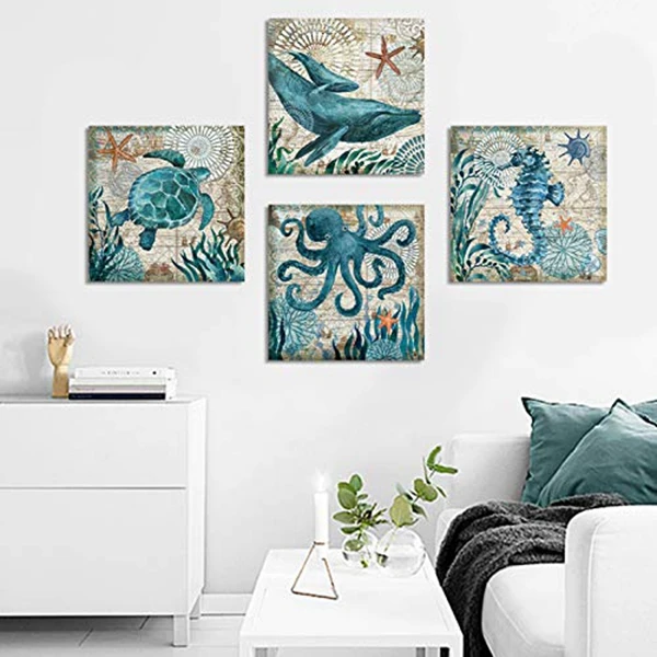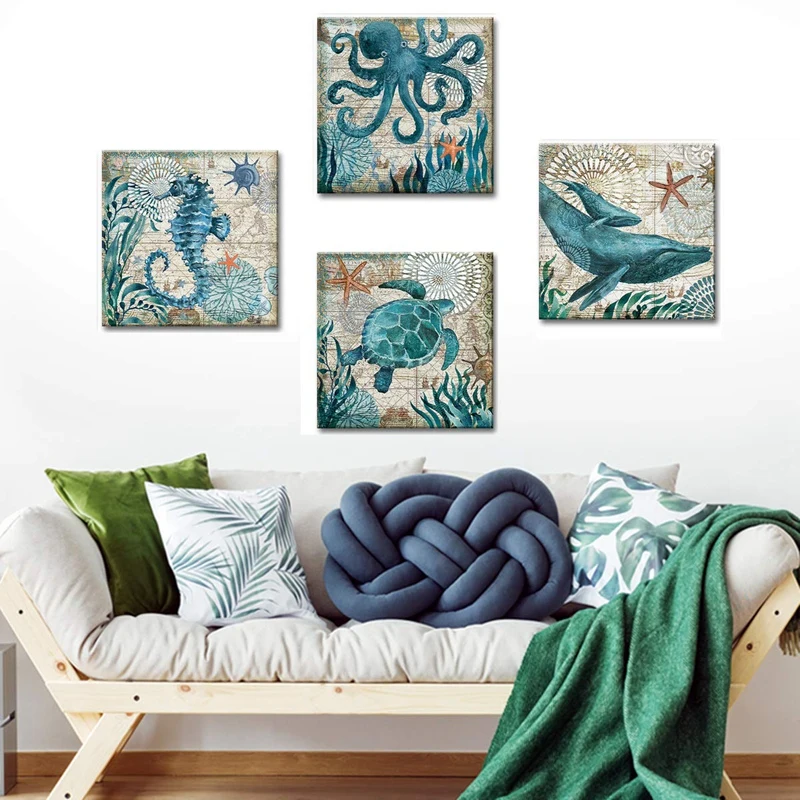 Размер продукта: 12inchx12inchx4 панель s(30x30cmx4) каждая панель-30x30cm-морская животная океанская тема картины, настенные декорации с изображением холста.