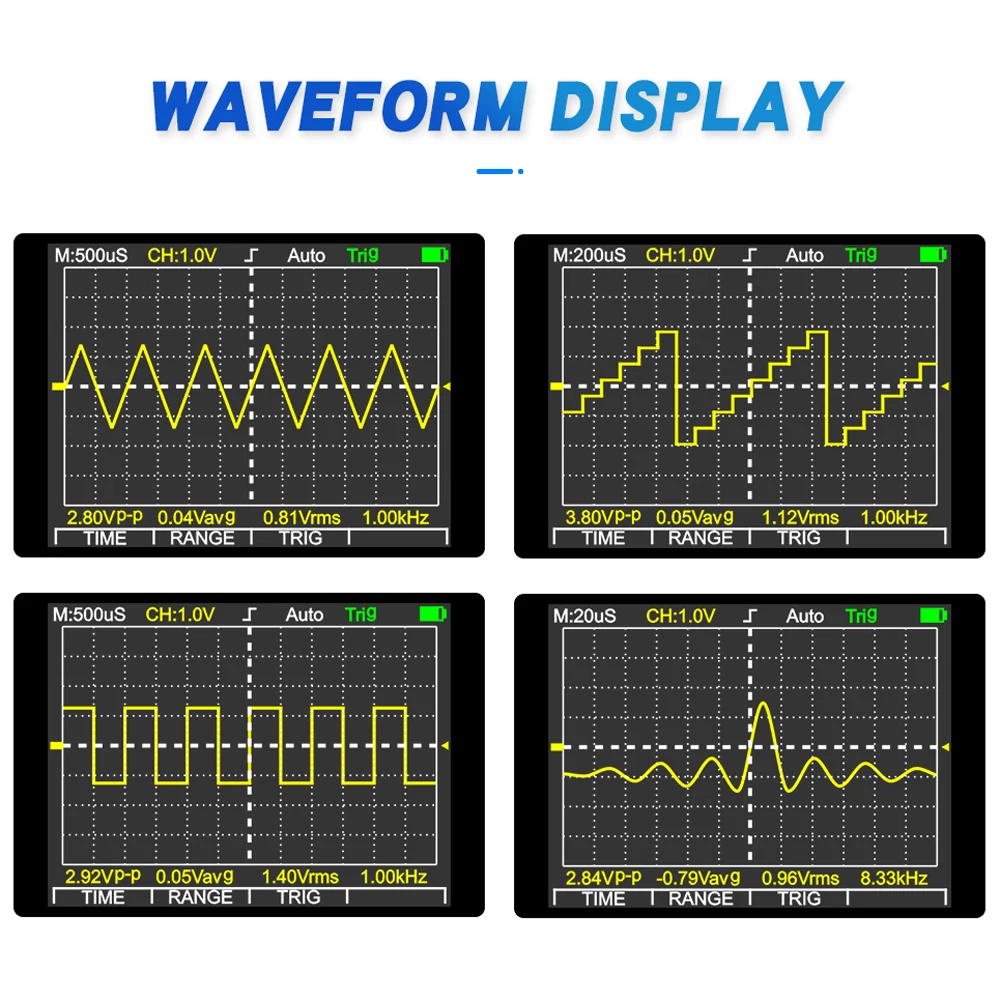 Functions: one ke-y oscilloscope, three scan modes: auto, normal and single, 12 kinds of test data, can store 2500 waveforms, support thumbnail browsing.