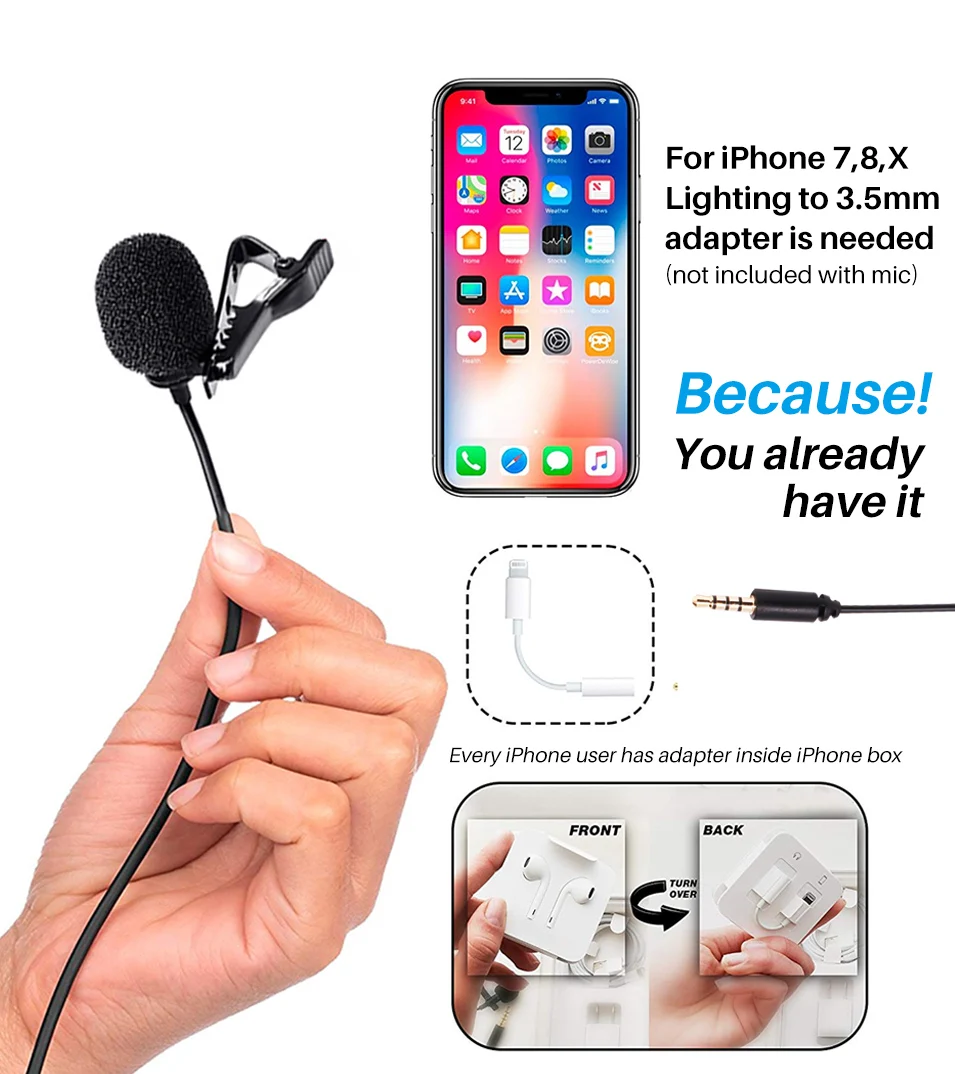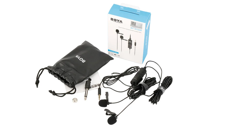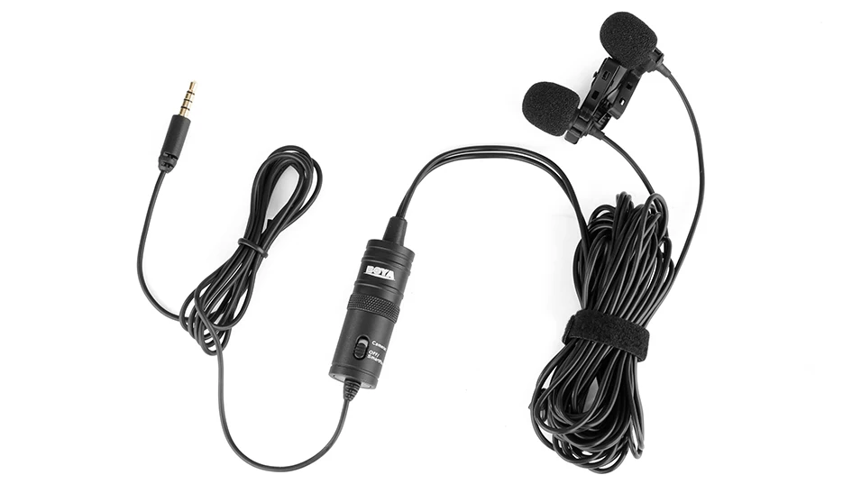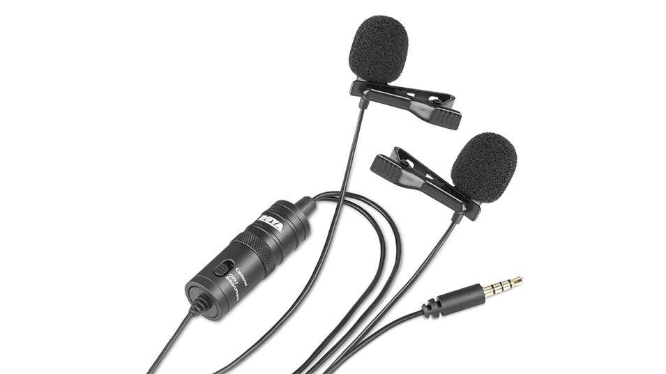 The BOYA BY-M1DM is a Dual Lavalier Universal Microphone, with a single 1/8" stereo connector, it can be used with smartphones,