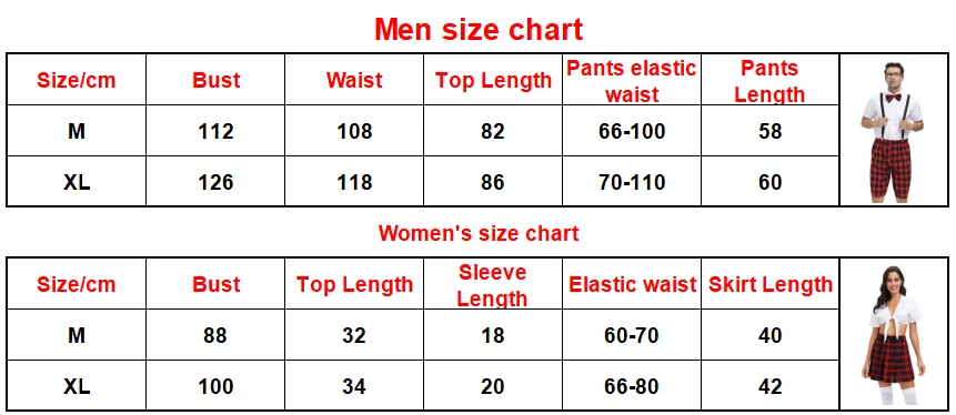 Изделия в комплекте: Дамы: топ + юбка Мужчины: топ + шорты + галстук-бабочка + подтяжки Размеры: M, XL Новое поступление! Размер костюма не такой, как размер одежды в вашей стране, Пожалуйста, ознакомьтесь с нашей таблицей размеров перед заказом.