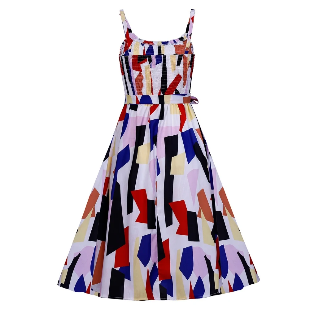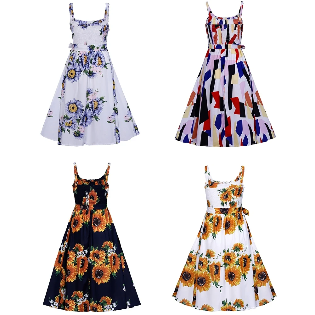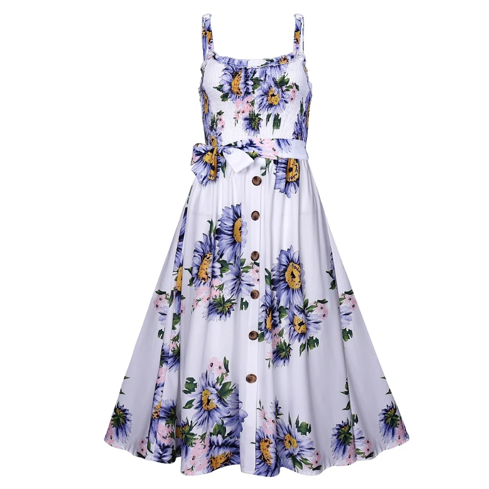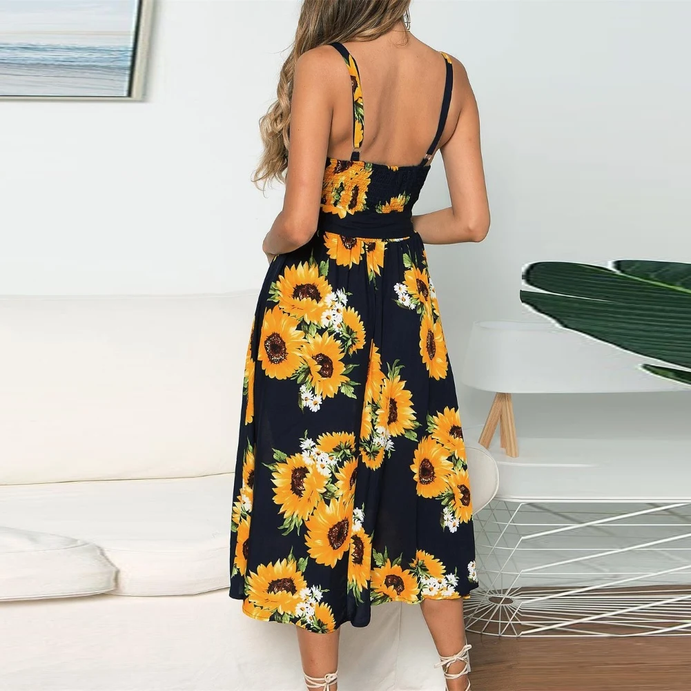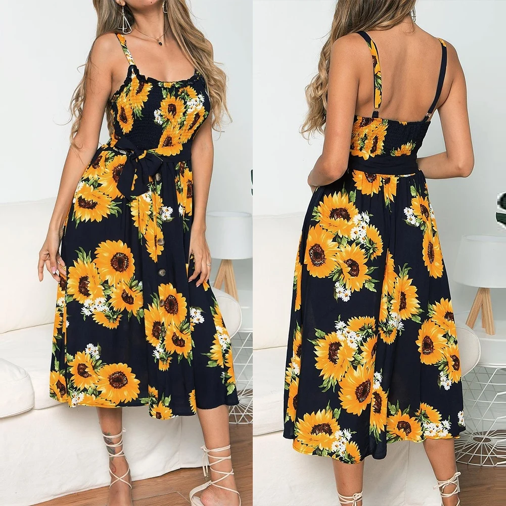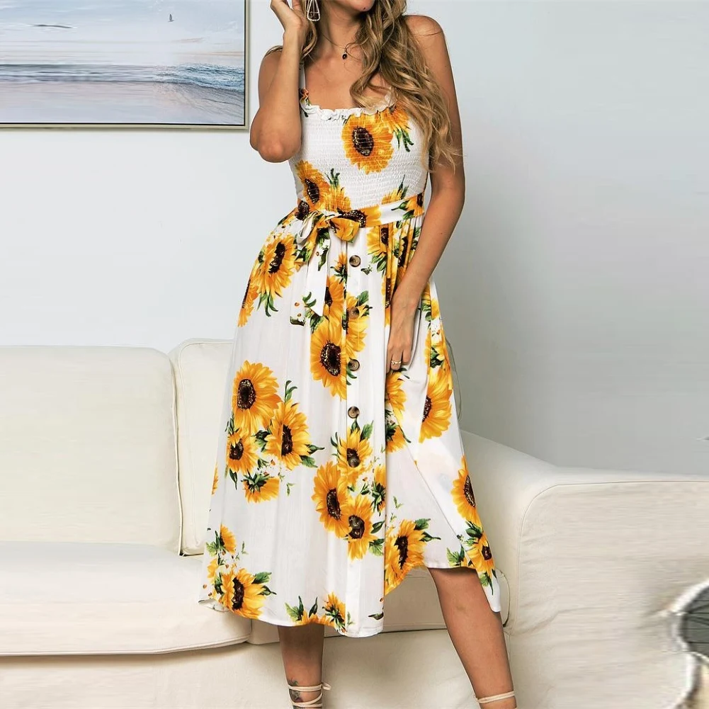 Модное женское летнее платье на бретельках с цветочным принтом и пуговицами в богемном стиле