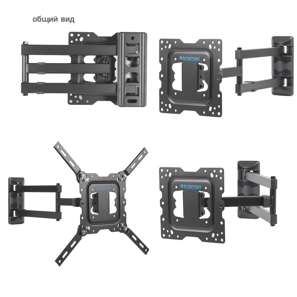 Мощный кронштейн имеет множество регулировок, такие как: наклон вверх-вниз на 15°, поворот влево или вправо на 90°, складываться к стене на максимально близкое расстояние до 66 мм или отодвигается от нее на максимально возможное расстояние до 605 мм, при помощи двух коленной конструкции.