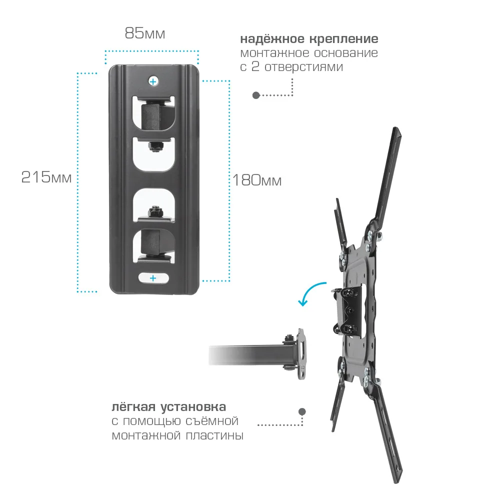 Надежная стальная конструкцияВращение экрана ±5°Минимальное расстояние до стены в сложенном виде 66 ммКабель-каналСъемная монтажная пластинаДекоративные накладки