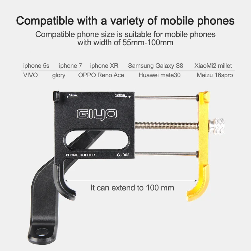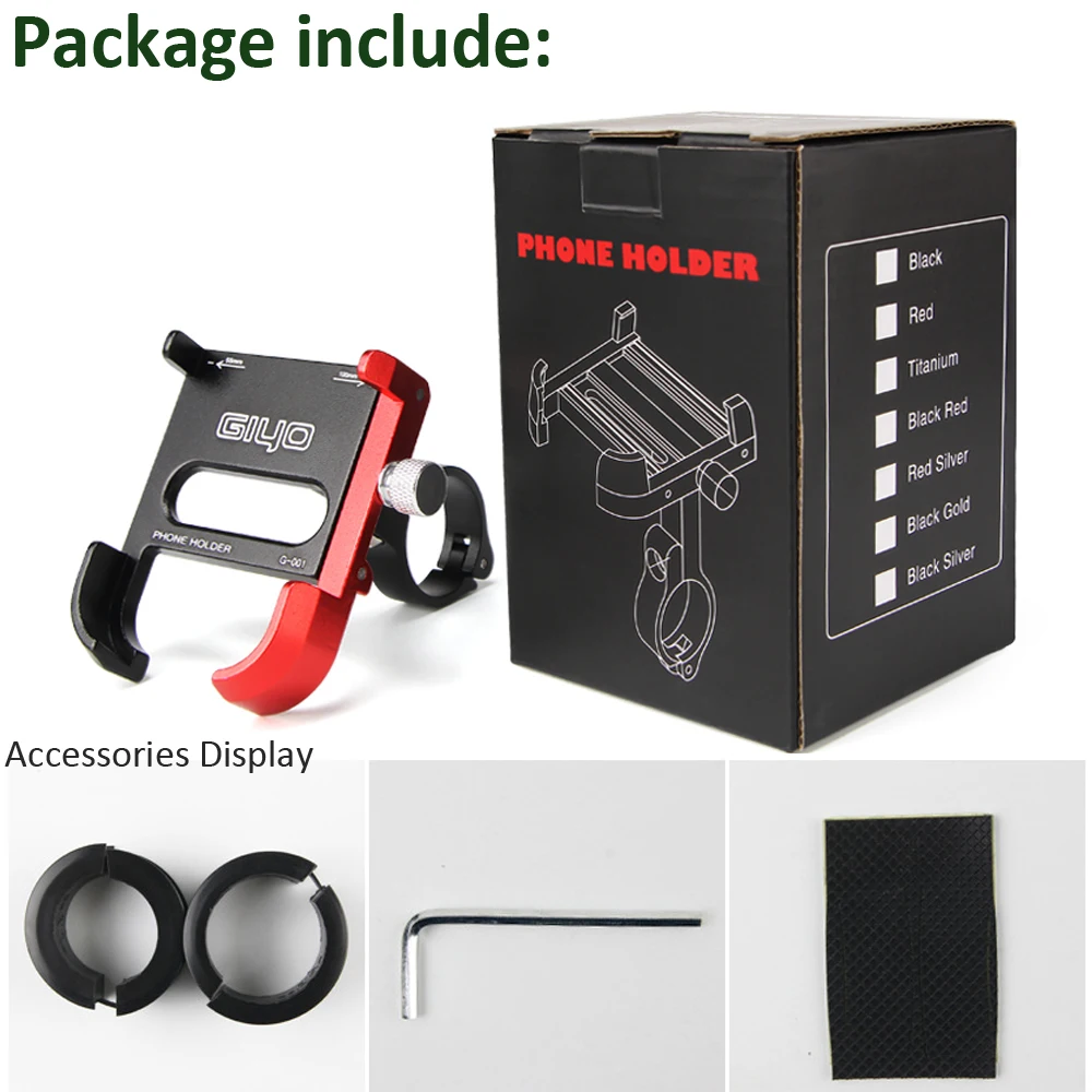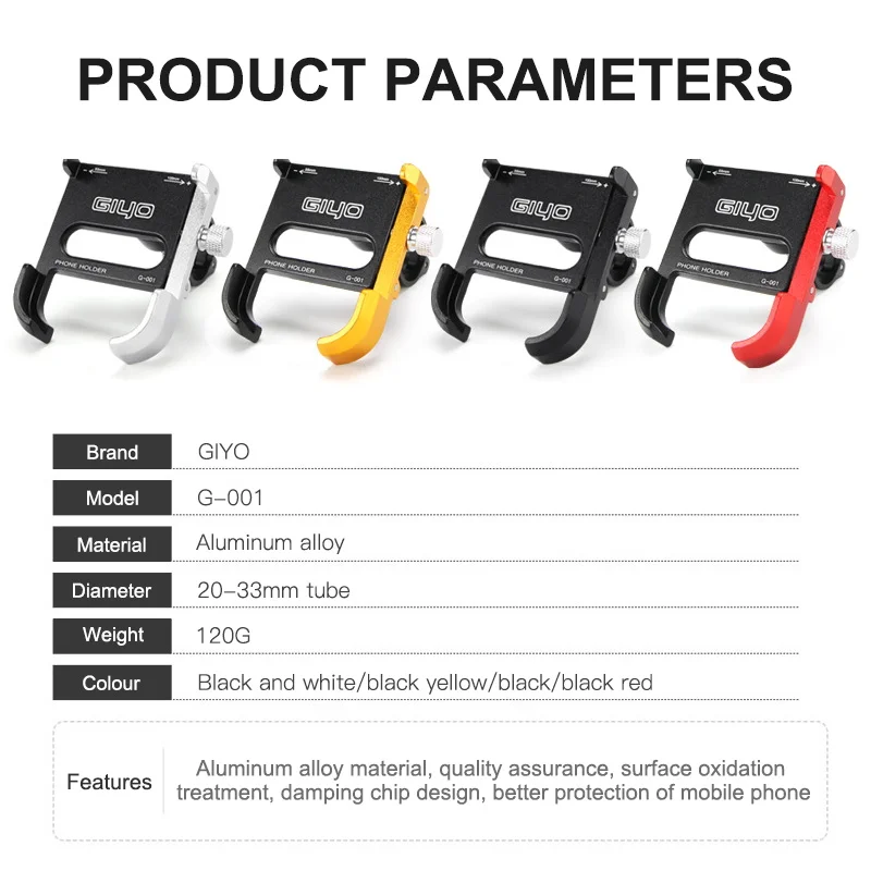 G-001/G-002 Технические характеристики: Бренд: GIYO Материал: алюминиевый сплав Цвет: черный/золотой/красный/серебристый Вес: около 171 г Подходящий Размер телефона: 55-100 мм/2,17-3,94 дюйма Размер изделия: Макс. 80-100 мм/3,15-3,94 дюйма Особенности: * Премиум алюминиевый сплав материал, прочный в использовании. * Вращающийся на 360 градусов, может регулировать угол одной рукой при езде на велосипеде. * Ударопрочный патч может защитить телефон от царапин. * Две прокладки различной толщины для широкого использования диаметра трубы 20-33 мм. * Противоскользящая текстура на клапане позволяет легко регулировать ширину. * Не блокирует ключи, порт для зарядки и порт для наушников. * Подходит для телефона шириной от 55 мм до 100 мм.