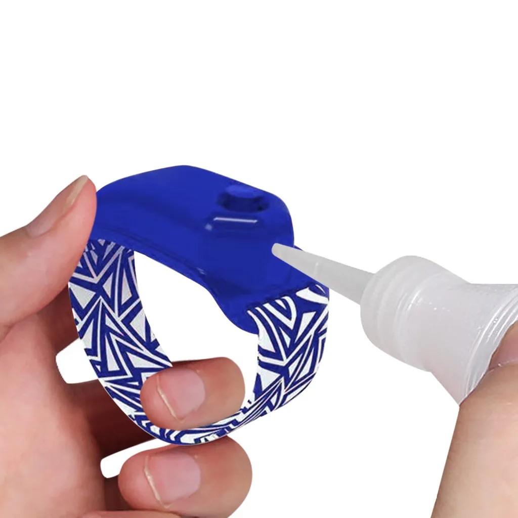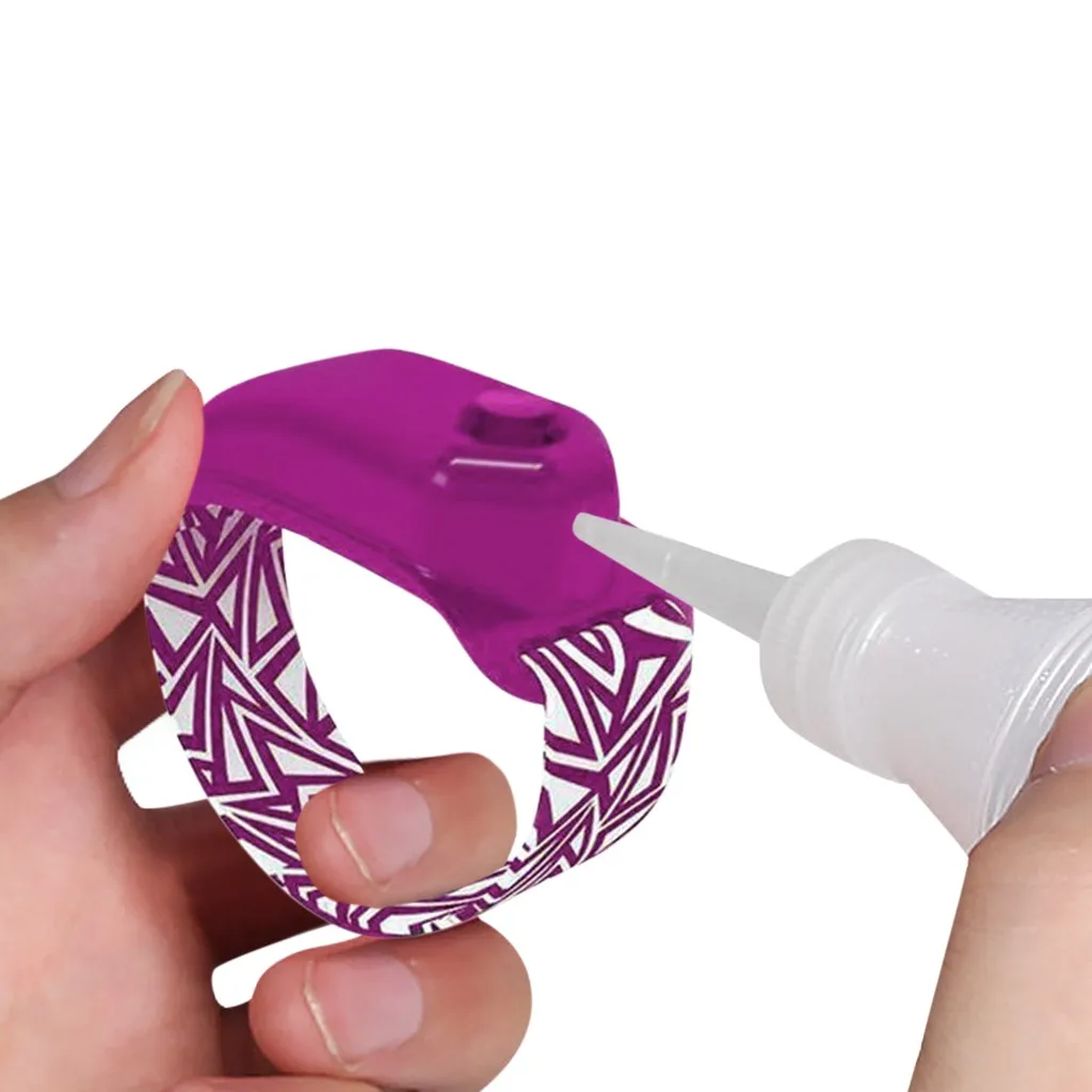 Просто поднимите колпачок для заправки и вставьте дезинфицирующее средство для рук, лосьон или продукт по вашему выбору в колпачок для заправки браслета. Плотно закрывайте крышку при заполнении.