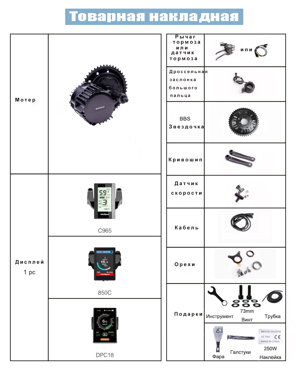 Подарки: экипажи 73 мм * 1, трубка * 1, инструмент * 1, стяжки * 1,250 Вт * 1, фара * 1