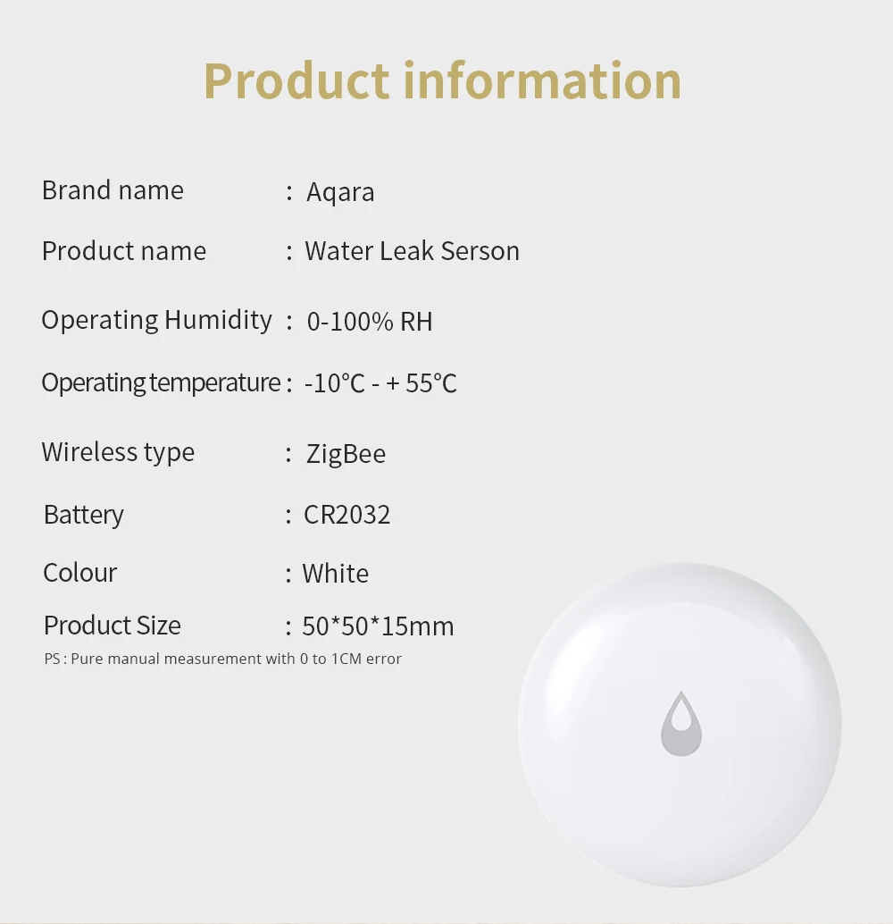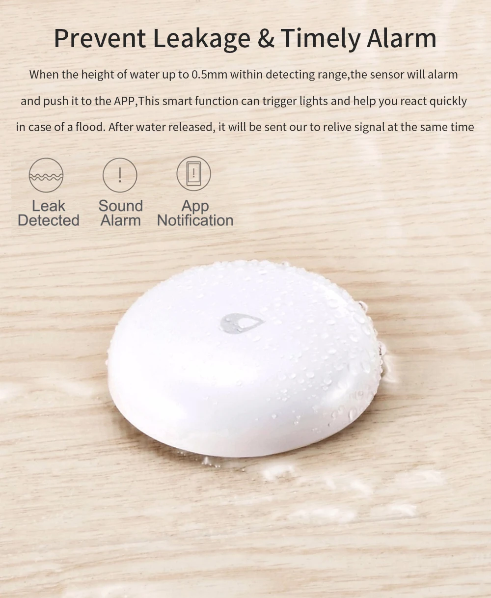 Описание: Умный датчик воды Aqara может своевременно обнаруживать в воде и удаленной сигнализации через приложение. Прочный аккумулятор используется для двух лет и может быть заменен. Класс водонепроницаемости IP67, идеально подходит для eave, сада, двора, балкона и т. д. простой модный дизайн, это не только датчик, но и украшение. Технология создает счастливую жизнь! Основные характеристики: Мониторинг погружения, своевременная сигнализация с помощью приложения Класс водонепроницаемости IP67, высокое качество и долговечность Нет установки, место на земле, маленький и изысканный Примечание: батарея CR2032 включена