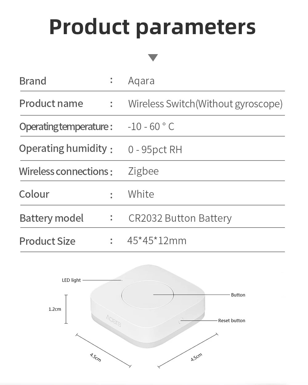 Основные характеристики: Работает с другими смарт-устройствами aqara Интеллигентая (ый) индукции: когда кто-то проходит, ночной Светильник включится автоматически Почувствуйте легкость и темность вашей комнаты Функция уведомления: отправлено оповещение вам через приложение Беспроводное соединение ZigBee Встроенный 1 шт. CR2450 аккумулятор Расстояние обнаружения: 7 м Угол обнаружения: 170 градусов Рабочая температура: -10 - 45 градусов по Цельсию Рабочая влажность: 0 - 95pct RH
