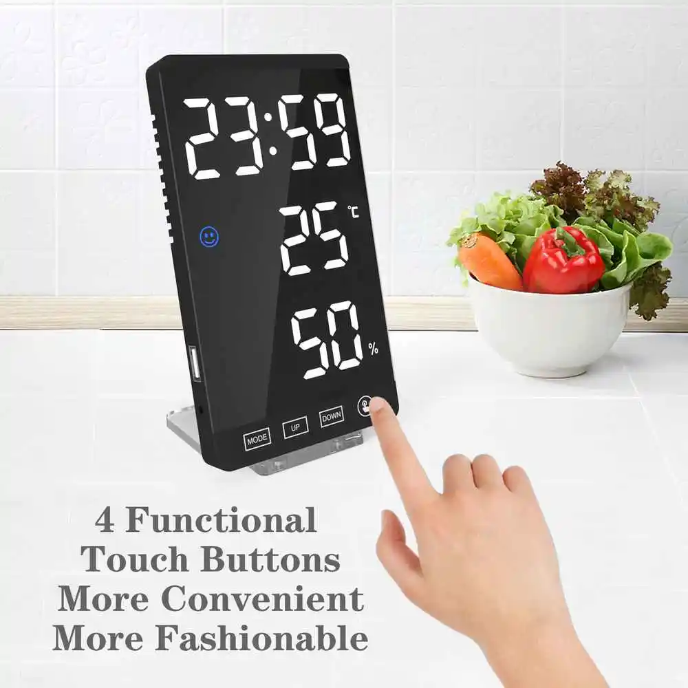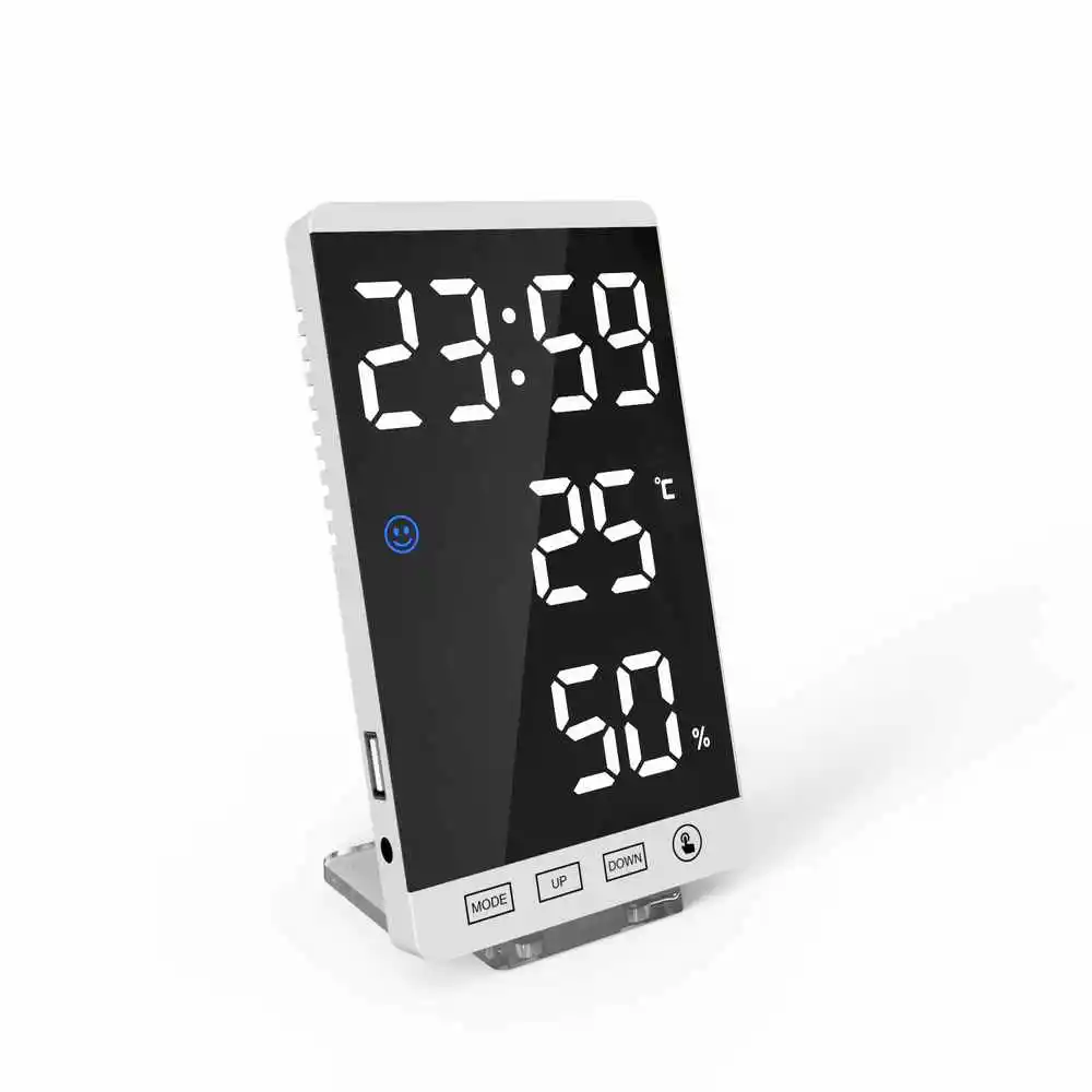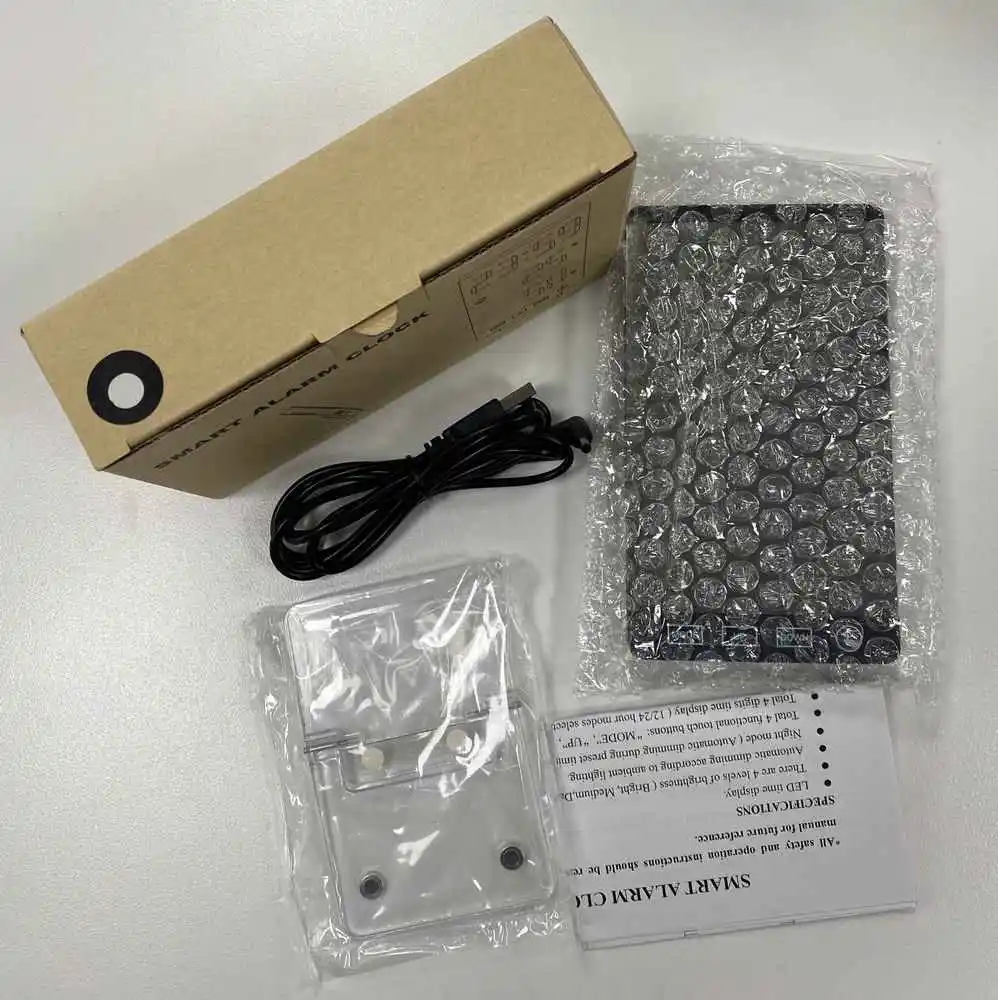 1. Функция: светодиодный дисплей, 24/12 часов отображения времени, 1 комплект будильника, дисплей температуры, дисплей влажности, индикатор комфорта, USB выход, сенсорное управление, четырехуровневый ручной датчик затемнения светильник, Автоматическое затемнение, функция отключения питания, функция магнитной адсорбции, съемные ножки