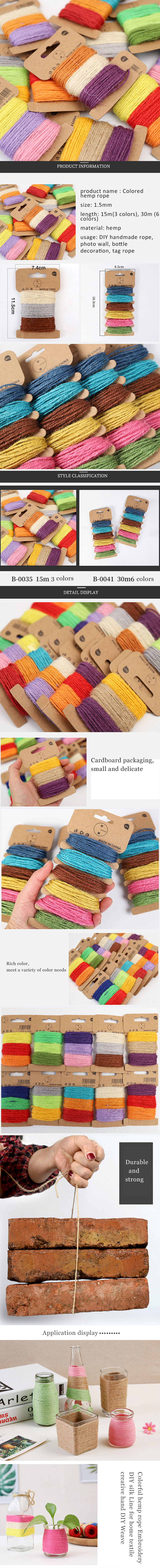 product name : Colored hemp rope size: 1.5mm length: 15m(3 colors), 30m (6 colors) material: hemp usage: DIY handmade rope, photo wall, bottle decoration, tag rope