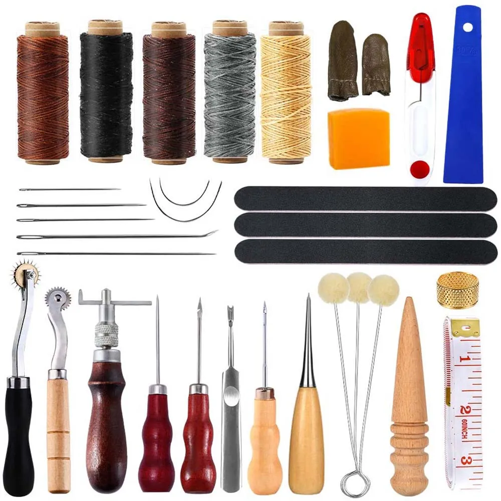4 x Awl 1 х наперсток 1 x пчелиный воск 1 ножницы 2 x пальчиковые Коты 3 х шерстяные мазни 3 х матовая полоса 5 х плоских восковых канатов 1 х v-образная груша 1 x измерение мягкой ленты 7 x ремонтные швейные иглы 2 x зубной инструмент для напорной ткани 1 х Регулируемая прострочка 1 х кожаные кромки дерева