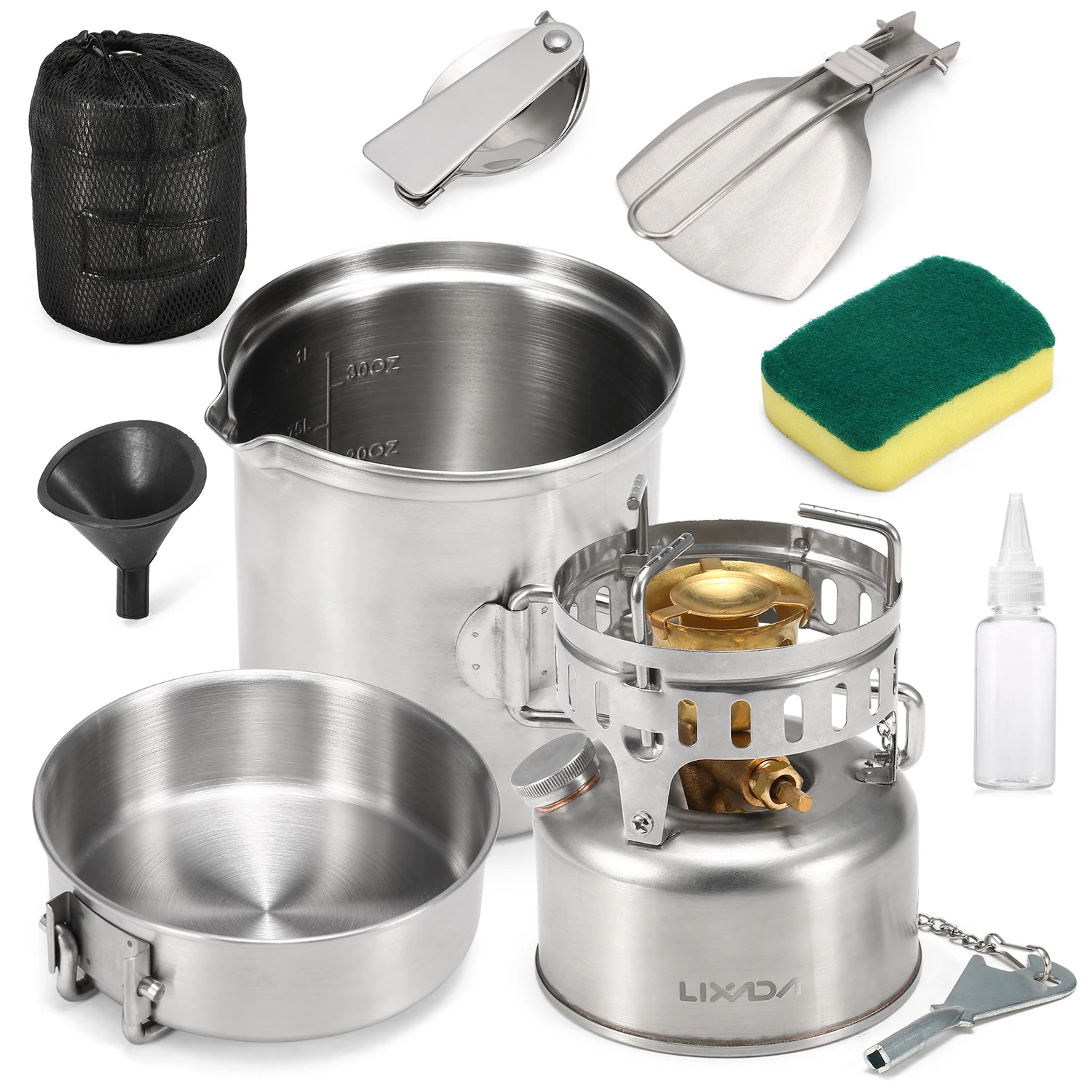 Этот набор посуды для кемпинга включает в себя бензиновую плиту, кастрюлю, сковороду, складной совок, СКЛАДНУЮ спортивную трубу, чистящую губку, воронку, пустую бутылочку для масла и сетчатый упаковочный мешок, очень удобно для кемпинга, пеших прогулок, альпинизма и других мероприятий на открытом воздухе.