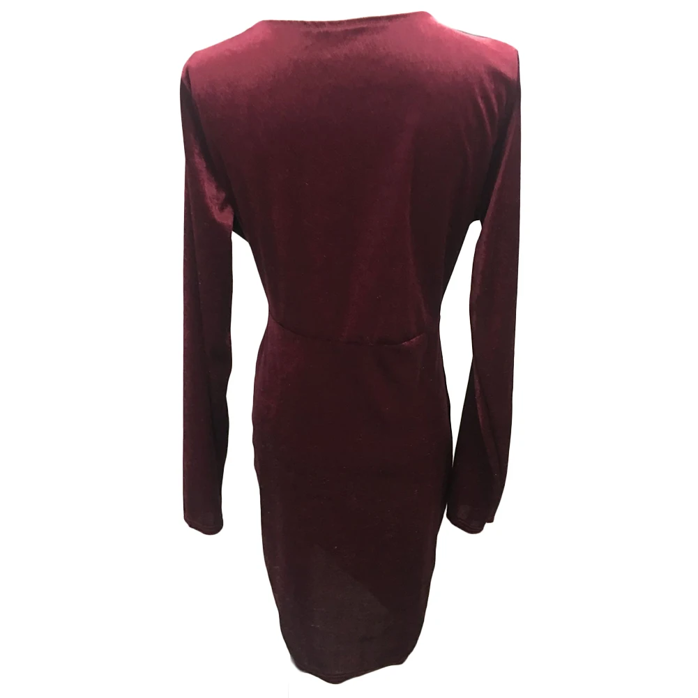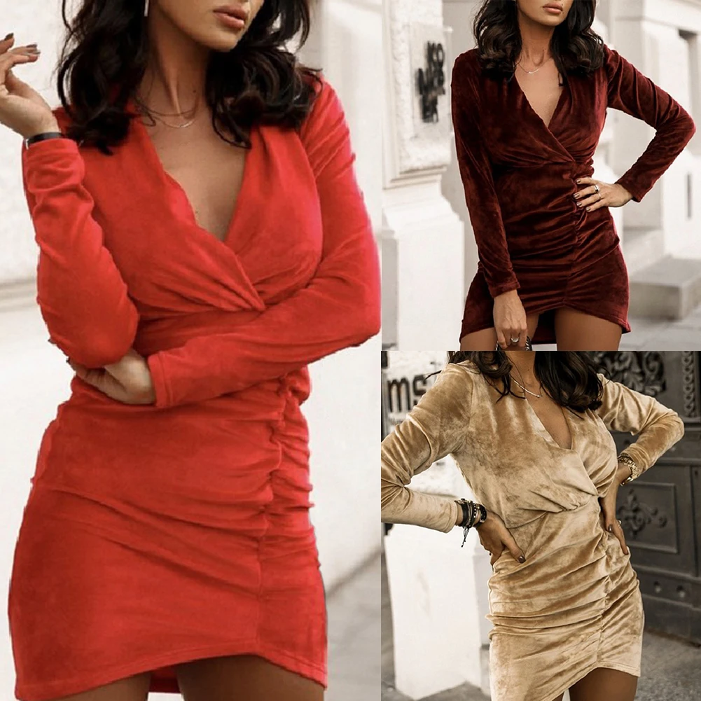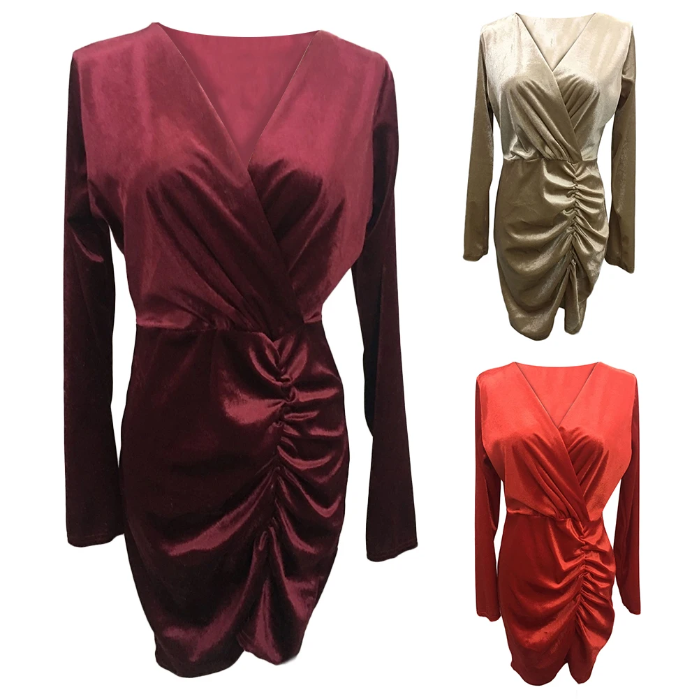 Women Sexy Solid Color Long Sleeve Velvet Ruched Irregular Hem Bodycon Dress
