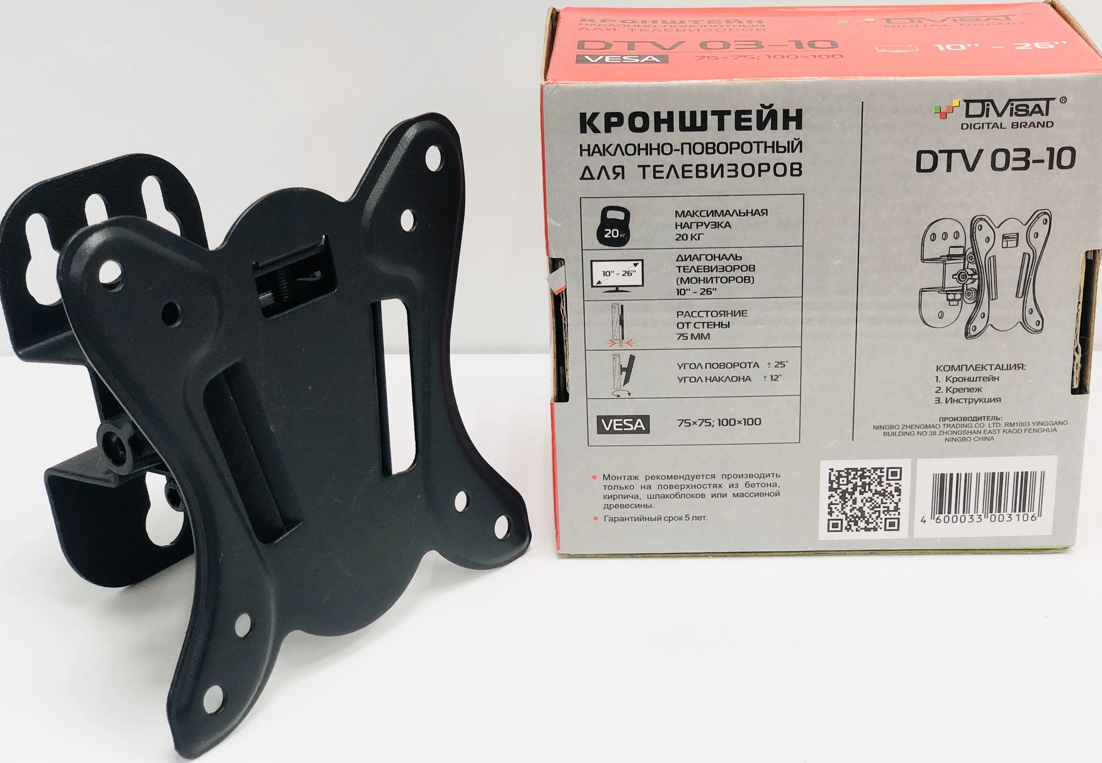 Кронштейн наклонно-поворотныйОписание:Диагональ - 10"- 26"Нагрузка - 20 кгРасстояние от стены 75 мм Наклон +/- 12°Поворот +/- 25°Поддержка крепления VESA 75 ×75 естьПоддержка крепления VESA 100 ×100 естьЦвет черныйКомплект:- Кронштейн - Крепеж- Инструкция