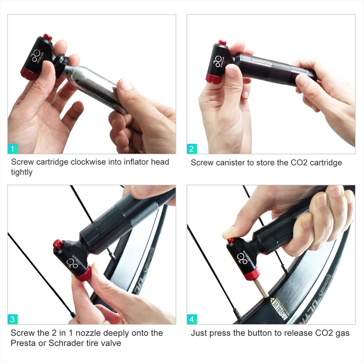 1. Длина: 45,3*125,5 мм, вес: 52,5 г 2. Лазерный логотип 3. Интегрированный обрабатывающий формовочный тип с ЧПУ Резка 4. Конструкция пресс-типа, которая выпускает CO2 газ Контролируемая 5. Совместим с клапаном presta и schrader 6. Инновационно разработанное хранение картриджей Канистра для СО2 картриджей Упаковочный лист Накачиватель CO2 * 1 Хранение картриджей канистра * 1