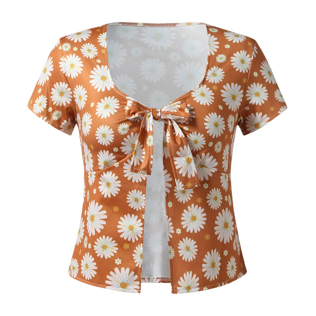 3. V Шея, Короткий рукавЦветочный принт, Шнуровка. A Базовый Топ с небольшой яркостью, sНе модно.