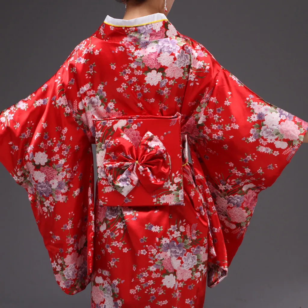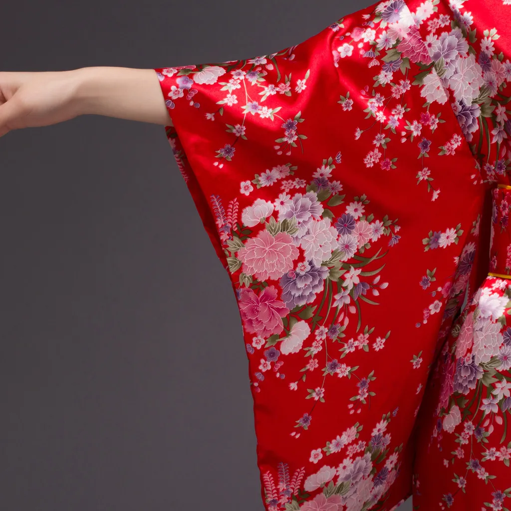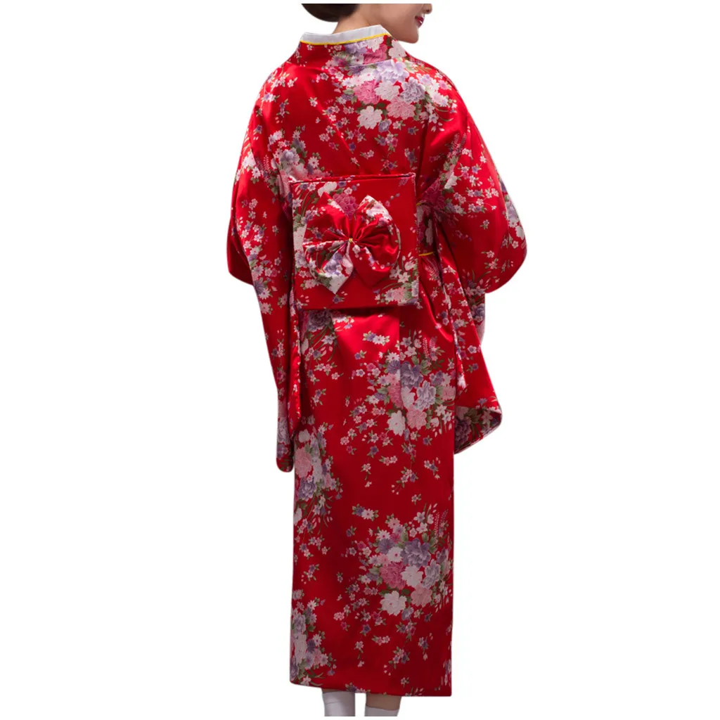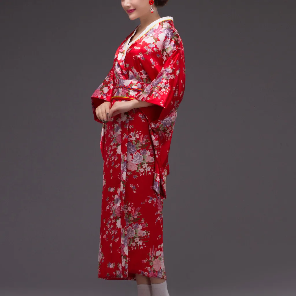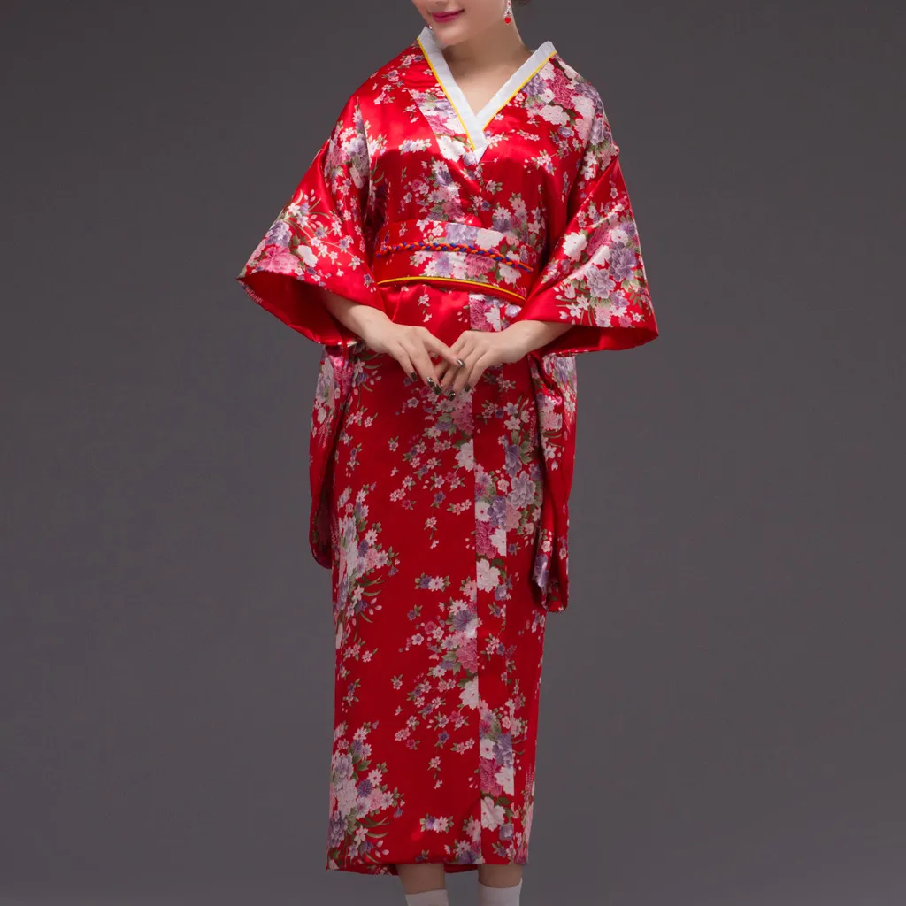 Имитация шелка кимоно с длинным рукавом женский красный халат с принтом