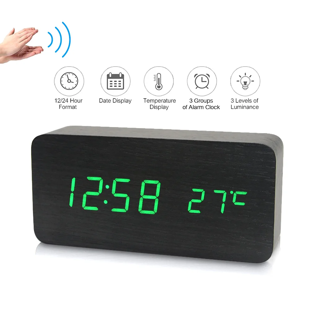 Чудесный Деревянный Будильник, светодиодный дисплей, идеально подходит для домашнего и офисного использования. Он имеет 3 режима отображения и 3 группы будильника. Питание от USB или аккумулятора, отвечает различным потребностям. Кроме того, он имеет функцию голосового управления, которая экономит энергию и не будет беспокоить вас во время сна.