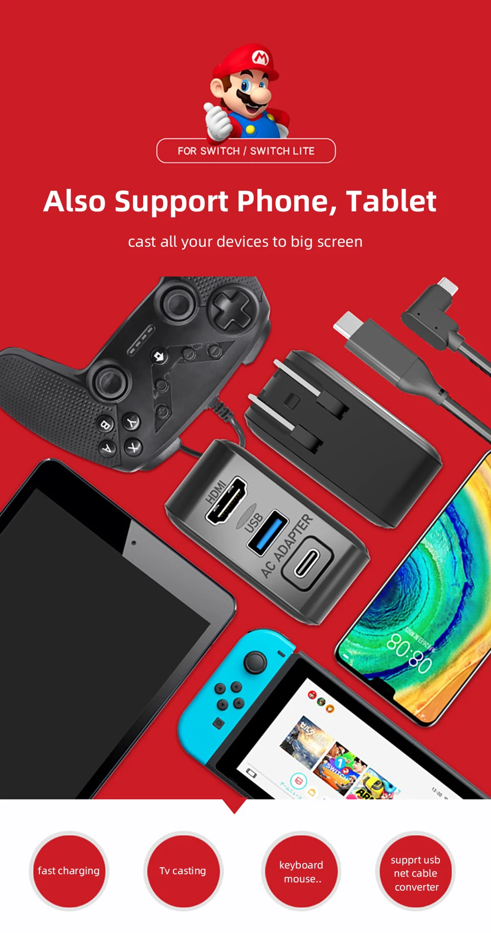 Это бренд CelBro @Многофункциональная док-станция для быстрой зарядки 3 в 1 для nintendo switch / switch lite, выход: 5 В 1,5a, 15V2.6A (режим быстрой зарядки), особенно поддержка ТВ-док-станции hdmi выход на большой экран телевизора, это идеальная замена для вашего оригинального зарядного устройства, проходят сертификацию CE, 3C,FCC.