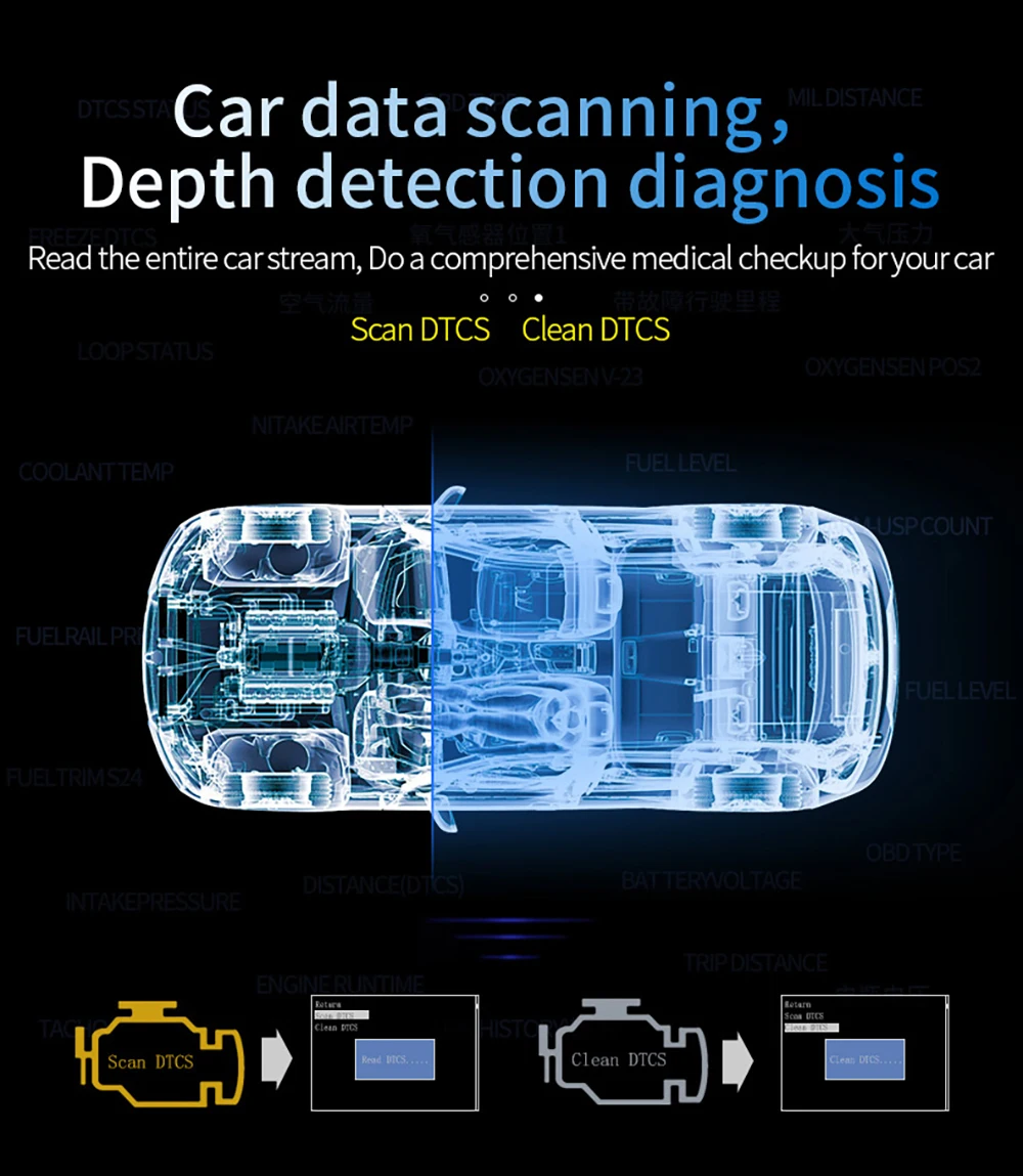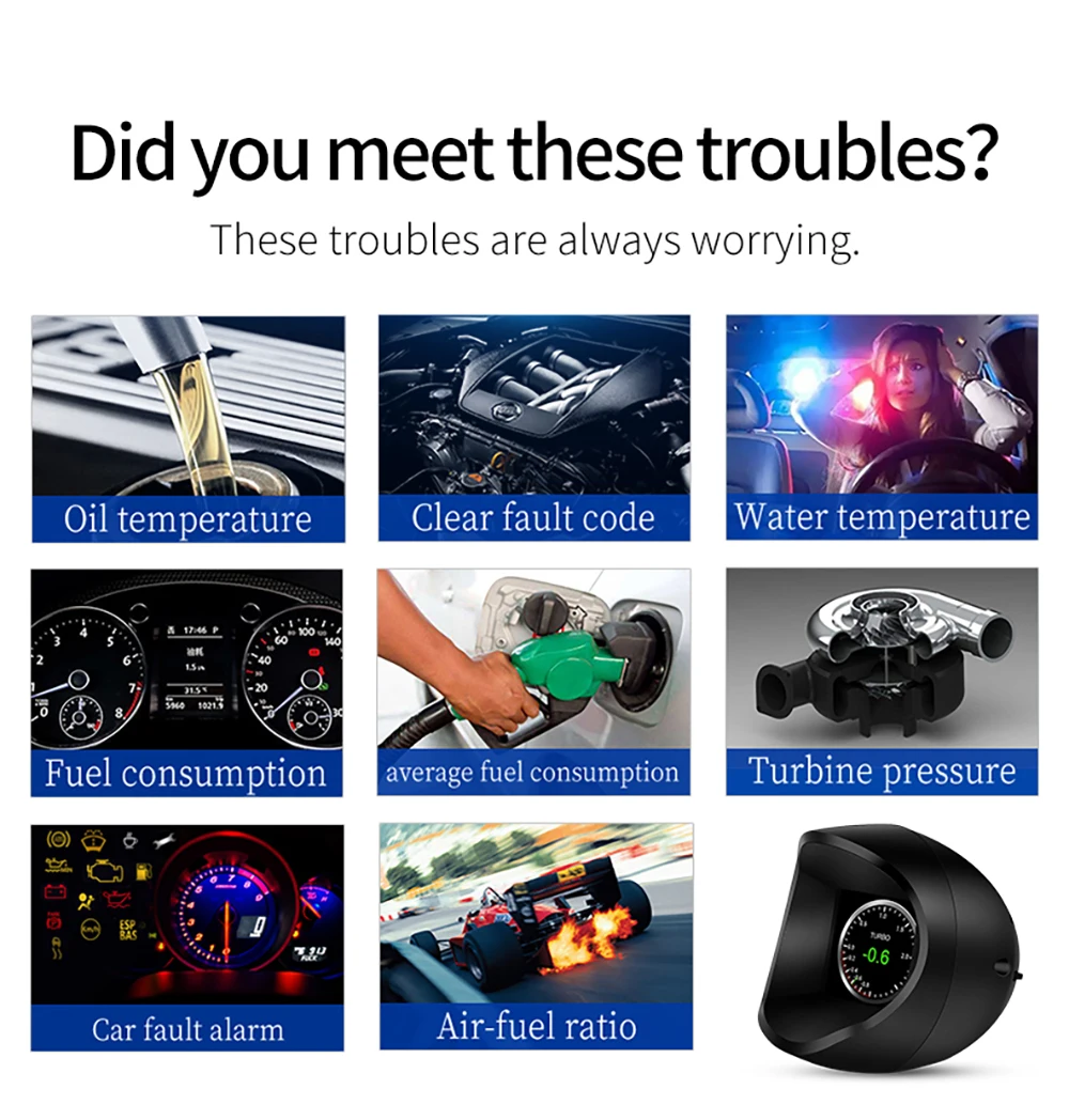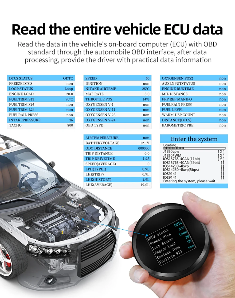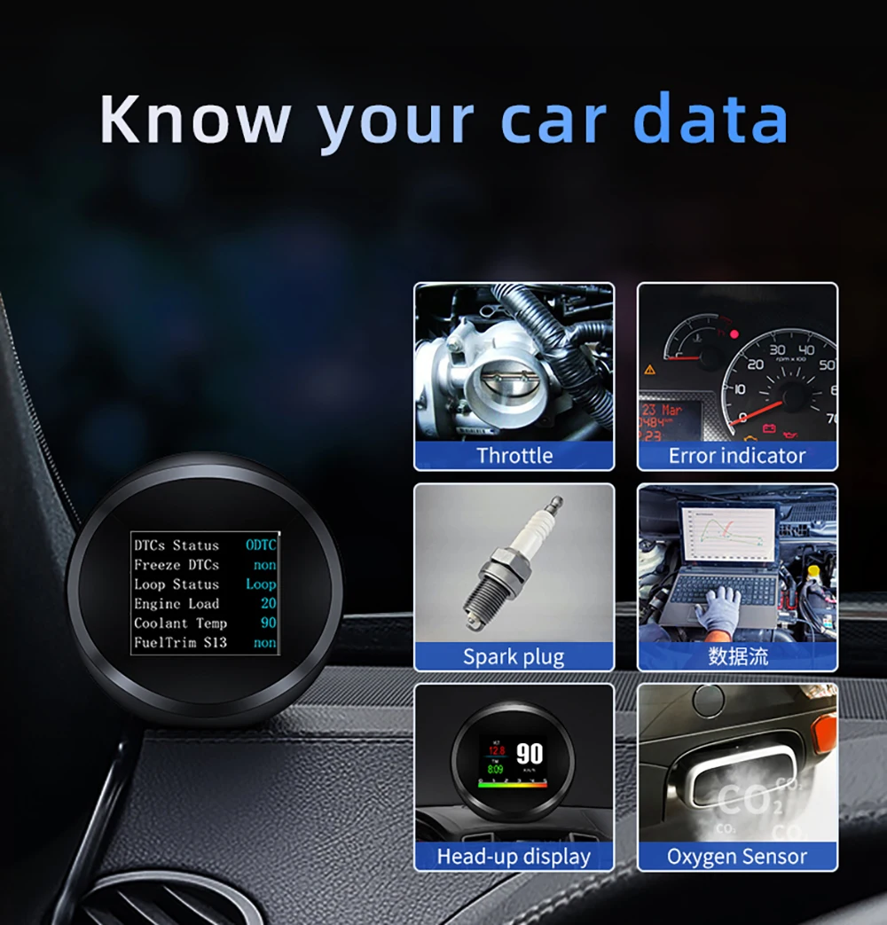 1. Отображение информации о режиме OBD: скорость транспортного средства, температура воды, напряжение, расход топлива, об/мин, один пробег, общий совокупный пробег, время в пути, системное время, давление впуска, температура масла, соотношение воздуха и топлива, давление турбины, давление впуска, испытание на ускорение, испытание тормозов, считывание потока данных.