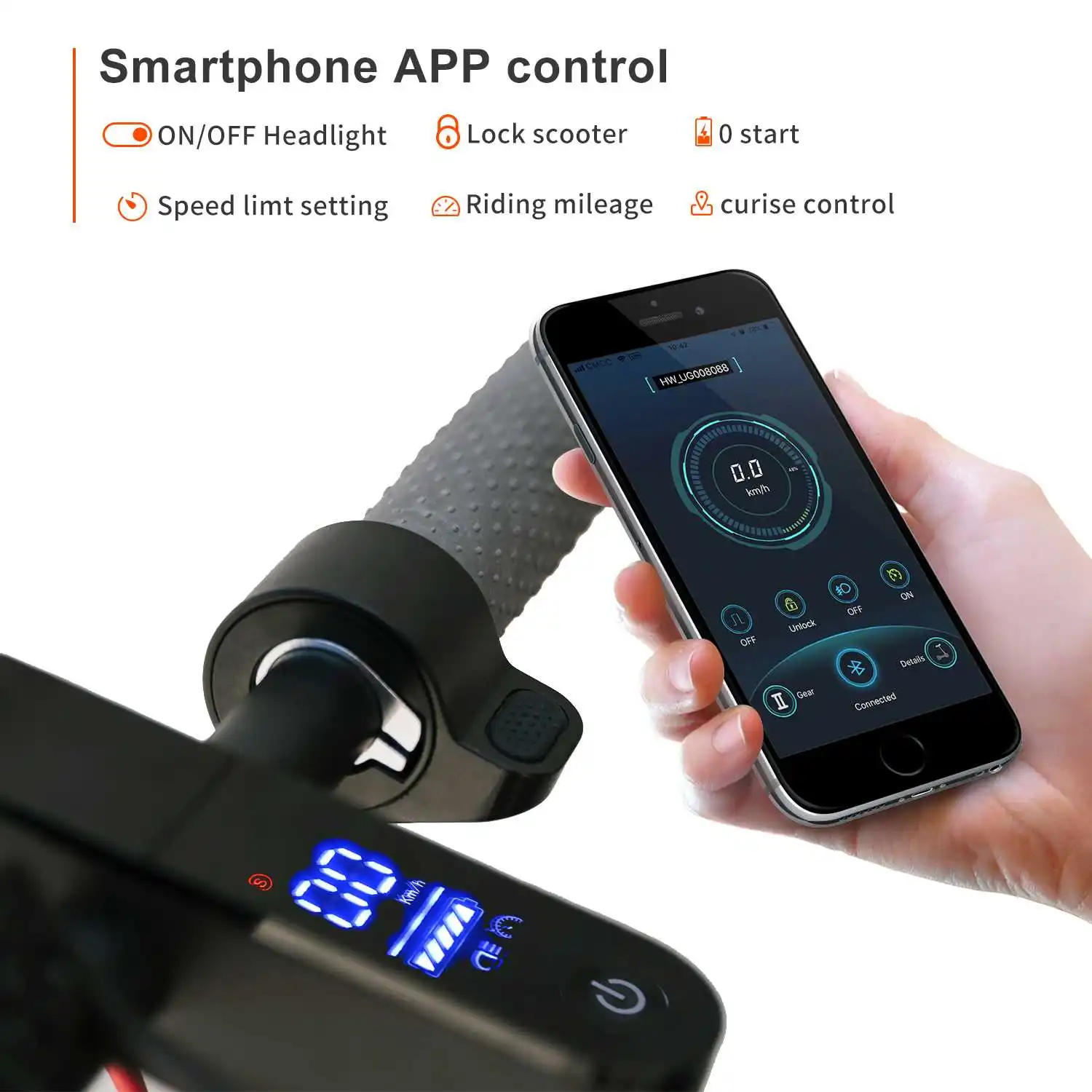 Приложение, дисплей скорости/батареи/пробега, блокировка приложения для скутера, выключатель света, выключатель самоката, круиз вкл/выкл, скорость самоката нулевая и безнулевая, автоматическое отключение настройки времени