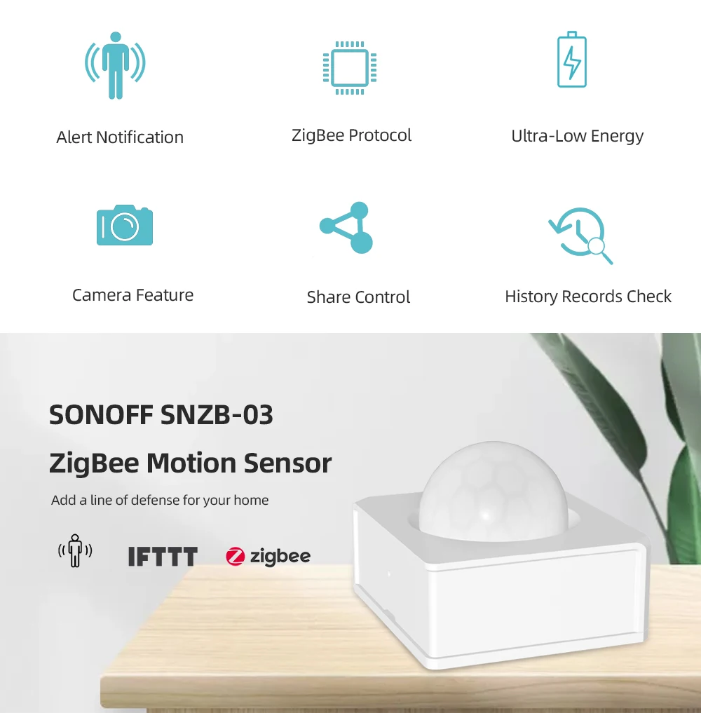 Особенности: Создание смарт-сцен для активации смарт-устройств Wi-Fi. Обнаружение движения и пусковое оповещение. Включите/выключите устройства через ваше движение. Работайте с камерой SONOFF, чтобы следить за вашим домом. Расстояние обнаружения 6 м и угол обзора 110 °. Поделитесь сенсором с семьей, чтобы вместе следить за своим домом. Проверка записей истории за 3 месяца. Уведомление о низком заряде батареи. Быстрая очистка и установка палки Спецификация: Батарея: 3В (CR2450); Беспроводной протокол: Zigbee (IEEE 802.15.4); Материал: Поликарбонат; Размер: 35x39x28мм