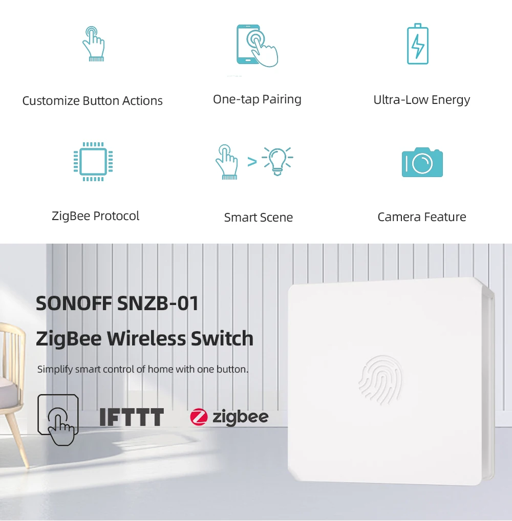 Особенности: Управляйте устройствами из любого уголка вашего дома. Установите умную сцену, чтобы она общалась с устройствами Wi-Fi. Двухсторонний контроль в светильник. Настройте действия кнопок в приложении. Сопряжение со всеми устройствами одним нажатием. Поддержка добавления камеры SONOFF для мониторинга состояния подключенных устройств. Уведомление о низком заряде батареи. Спецификация: Вход: 5 в 1 А; Беспроводной соединения: IEEE 802,11 b/g/n 2,4 ГГц, Zigbee 3,0; Материал: ПК V0; Размер: 62x62x20мм Поддержка подустройств: BASICZBR3 Smart Switch, S31 Lite zb Smart Plug, SNZB-01 беспроводной переключатель, SNZB-02 Temp. И ГУМ. Датчик, SNZB-03 датчик движения, SNZB-04 беспроводной датчик двери/окна