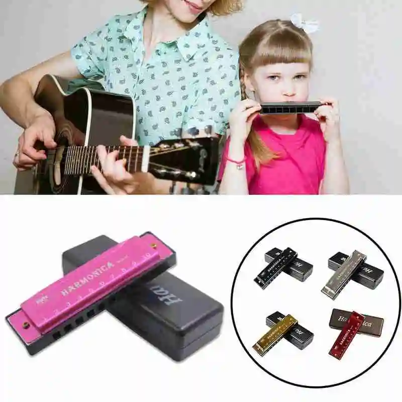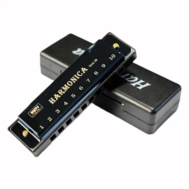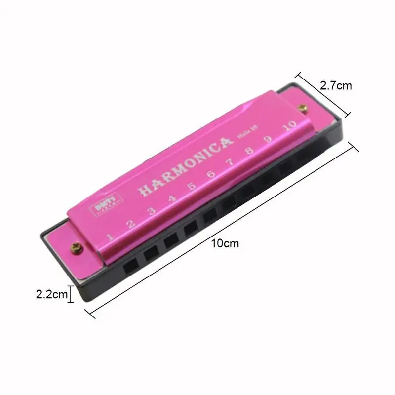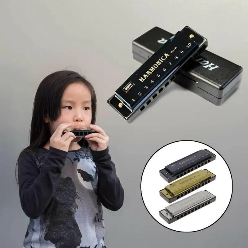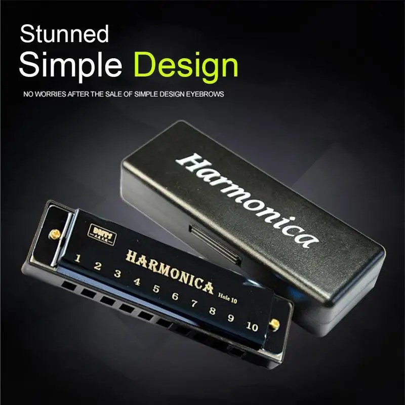There are two reeds in each sound hole, each of sound hole can emit two sounds (suck and blow), so there are 20 tones. Number on the harmonica body (1-10) reprensents the pitch, the more large number, the more high pitch. just blow or suck the hole with the number on the harness, it's very easy for everyone.