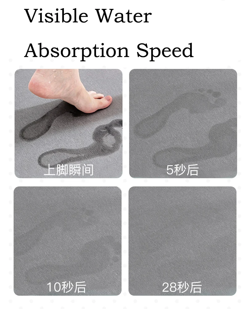 1. Диатомит земли коврик для ванной превосходит традиционные тканевые коврики для ванной с уникальной способностью поглощать и эффективно рассеивать воду. Держите ноги или пол сухими и чистыми, вы можете видеть, что водяные знаки исчезают в течение 2 минут.