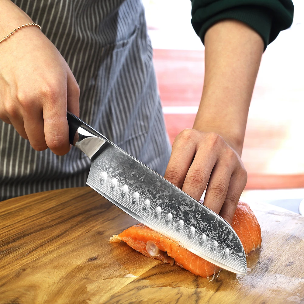 * Доставка в другие страны: около 15-25 дней2. Доставка со склада в России* Доставка в Россию: около 4-7 дней* Доставка в Беларусь: около 4-7 дней* Доставка в Казахстан: около 9-15 днейKEEMAKE 7 "Дамасская сталь Santoku ножВес:243GДлина лезвия: 7"/17,8 смДлина ножа:12 "/30,5 смТолщина:2,2 ммМатериал лезвия:Импортная Японская VG10 супер сталь с 73 слоями высокой дамасской стали