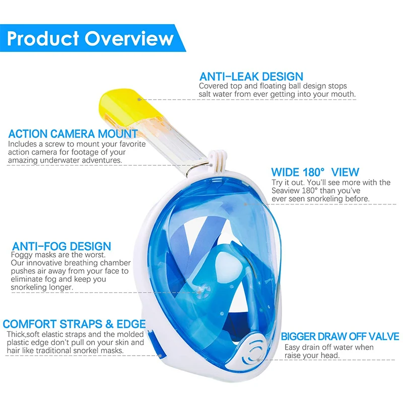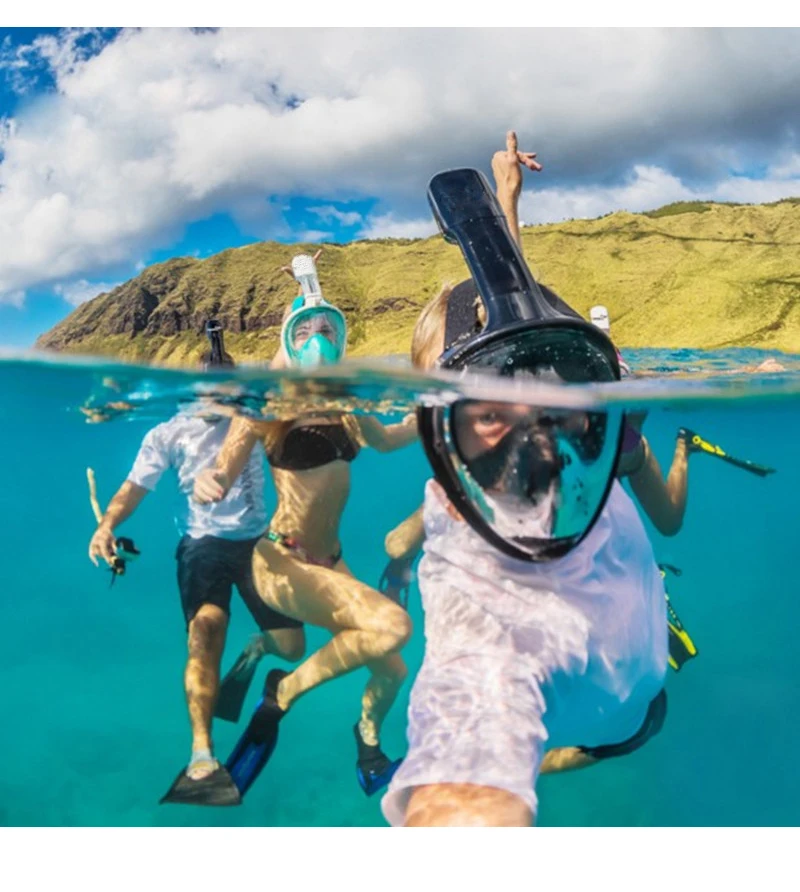 Панорамный обзор на 180 °-новый дизайн с полным лицом позволяет вам видеть абсолютно все вокруг вас во время дайвинга. Наше снаряжение для подводного плавания обеспечивает полную видимость для впечатляющего погружения.