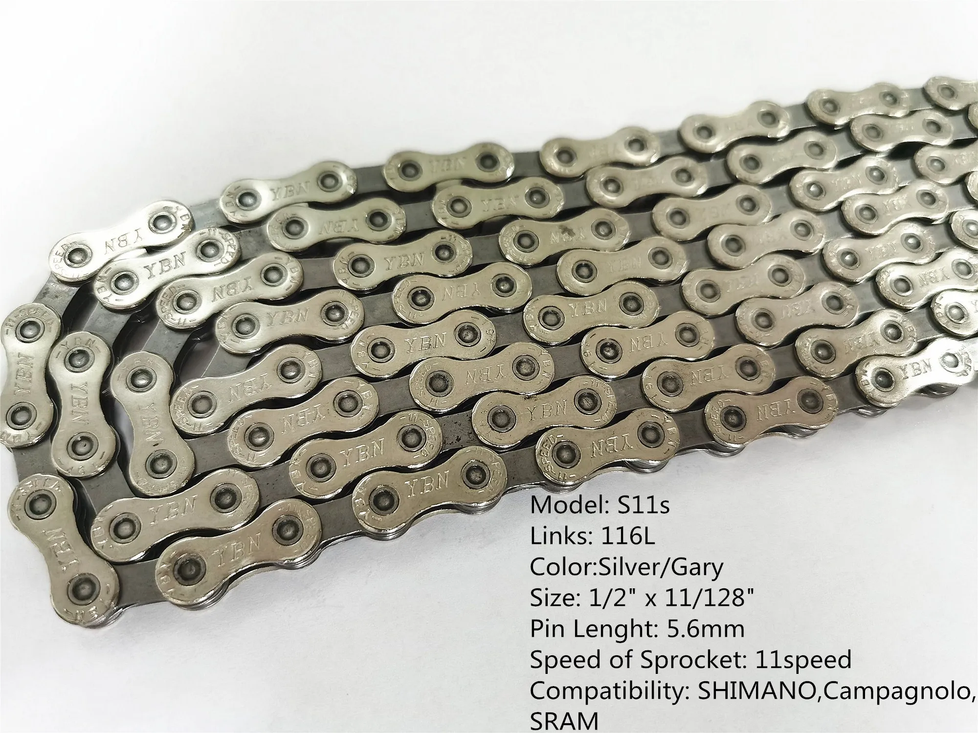 Модель: S11 Цвет: Ti-N Золотой/NP Серебряный/серебристо-серый Спецификация: 1/2 "x11/128" Длина штифта: 5,6 мм Ссылки: 116L Вес: 265 г/116л Совместимость: Shimano,Sram,Campagnolo и другие 11 скоростей * DHA-карбидный штырь хрома & Ролик Сделано в Тайване