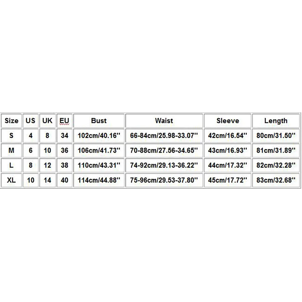 Что вы получаете: 1 женское платьеРазмер США Великобритания ЕС Бюст Талия Рукав Длина S 4 8 34 102 см/40,16'' 66-84 см/25,98-33,07'' 42 см/16,54'' 80 см/31,50'' М 6 10 36 106 см/41,73'' 70-88 см/27,56-34,65'' 43 см/16,93'' 81 см/31,89'' L 8 12 38 110 см/43,31'' 74-92 см/29,13-36,22 дюйма 44 см/17,32'' 82 см/32,28'' XL 10 14 40 114 см/44,88'' 75-96 см/29,53-37,80'' 45 см/17,72'' 83 см/32,68''