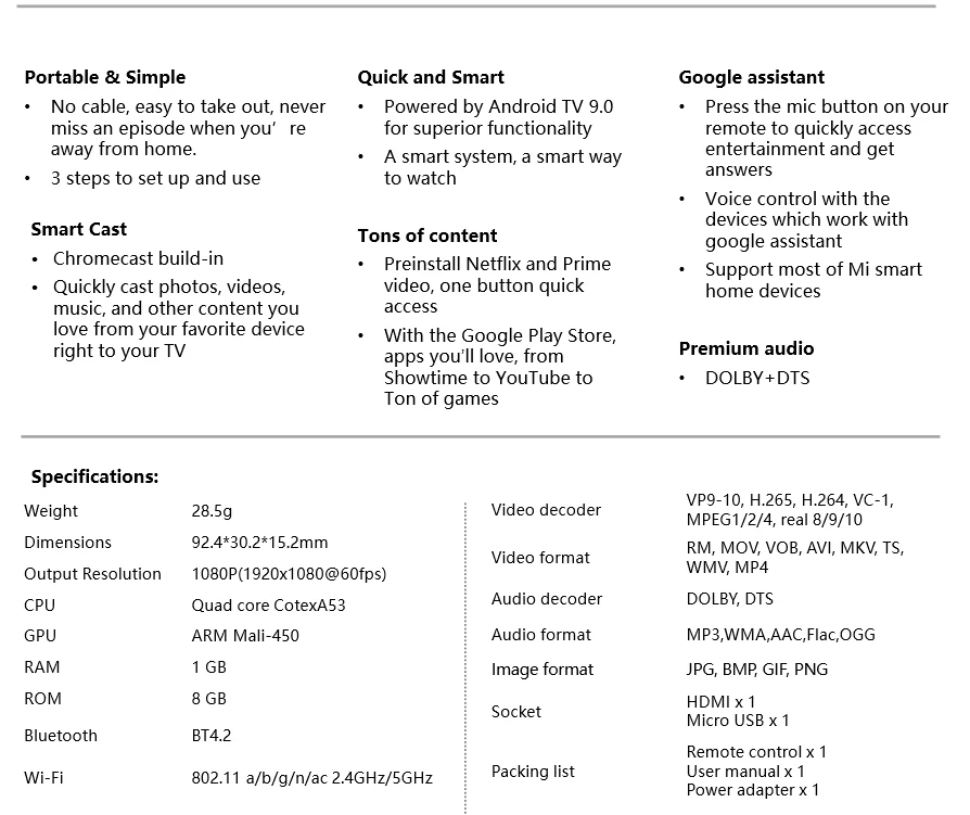Премиум объемного звучания Mi TV Stick поддерживает многоканальное HD аудио-кодирование DTS. Результат-более плавный, динамичный, захватывающий и реалистичный объемный стереозвук во время воспроизведения видео ultra HD Blu/ray